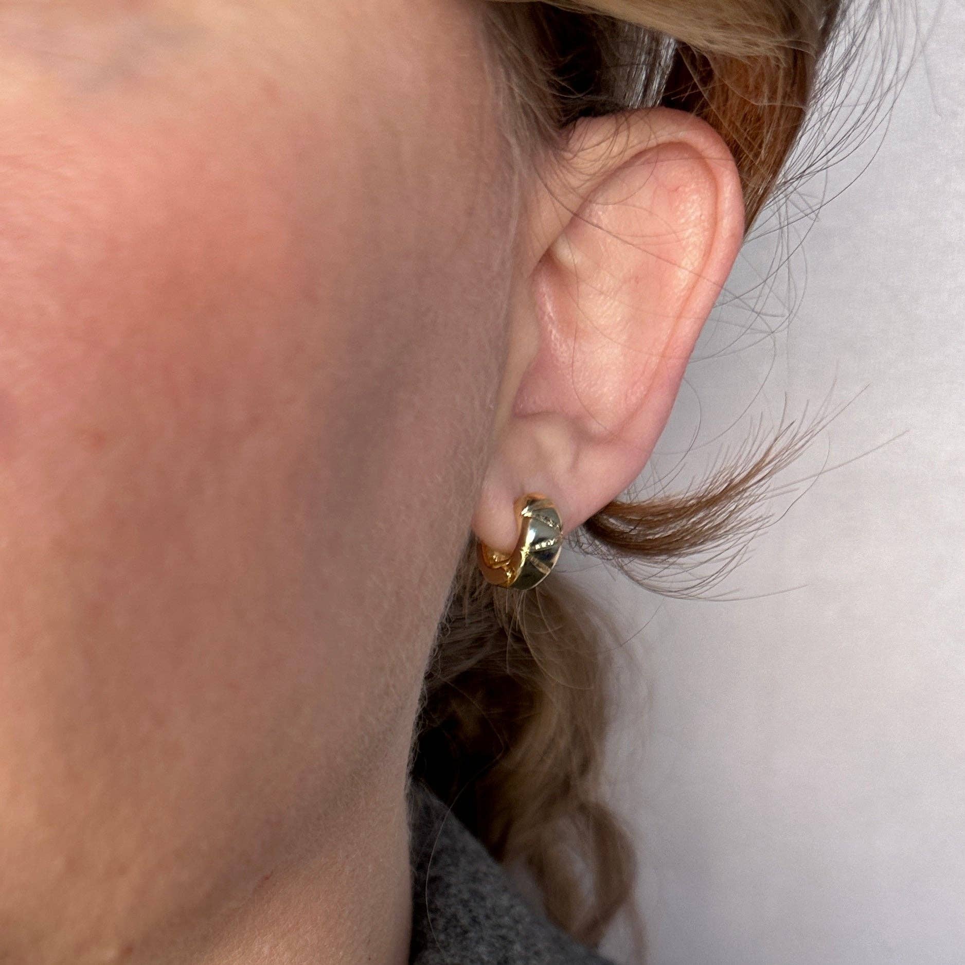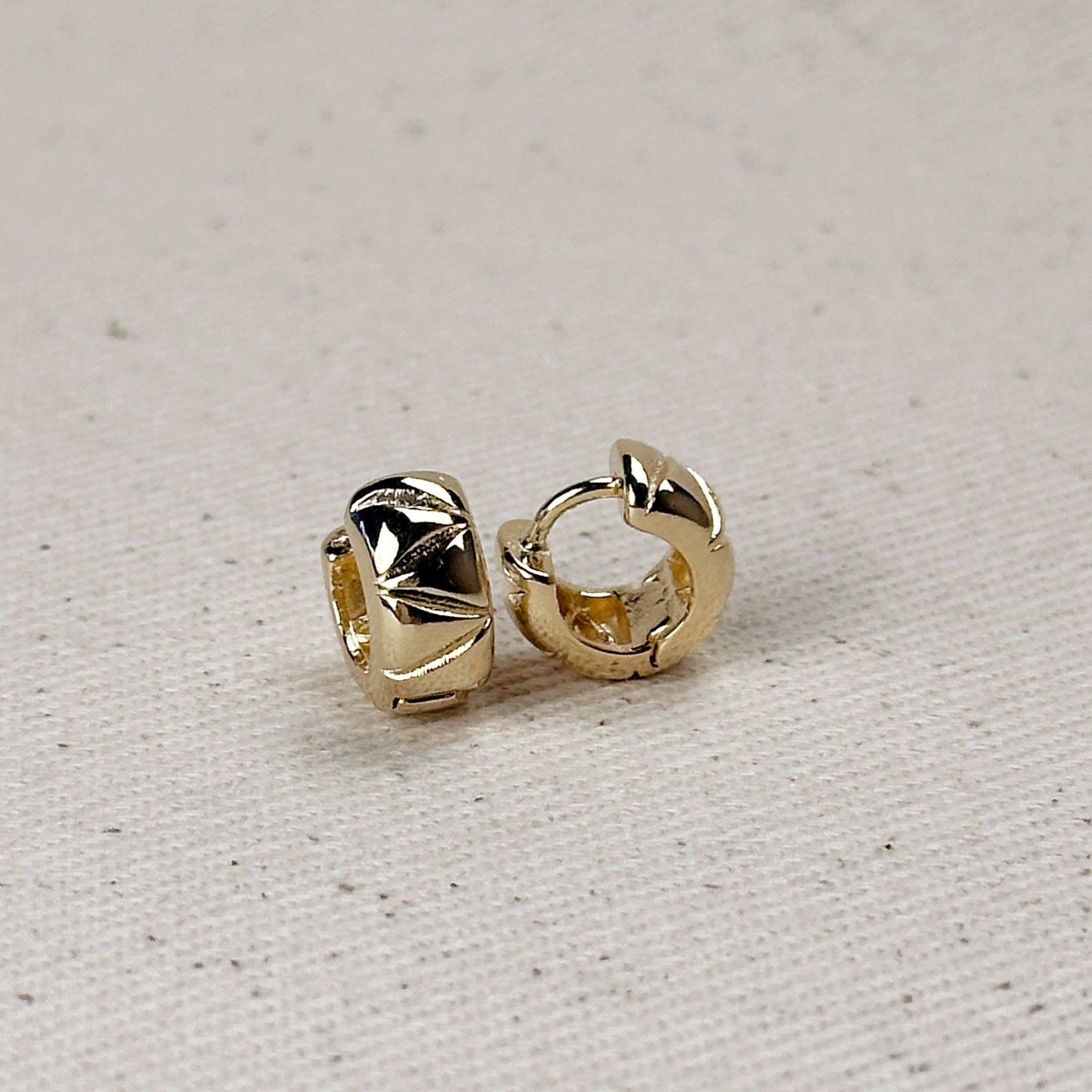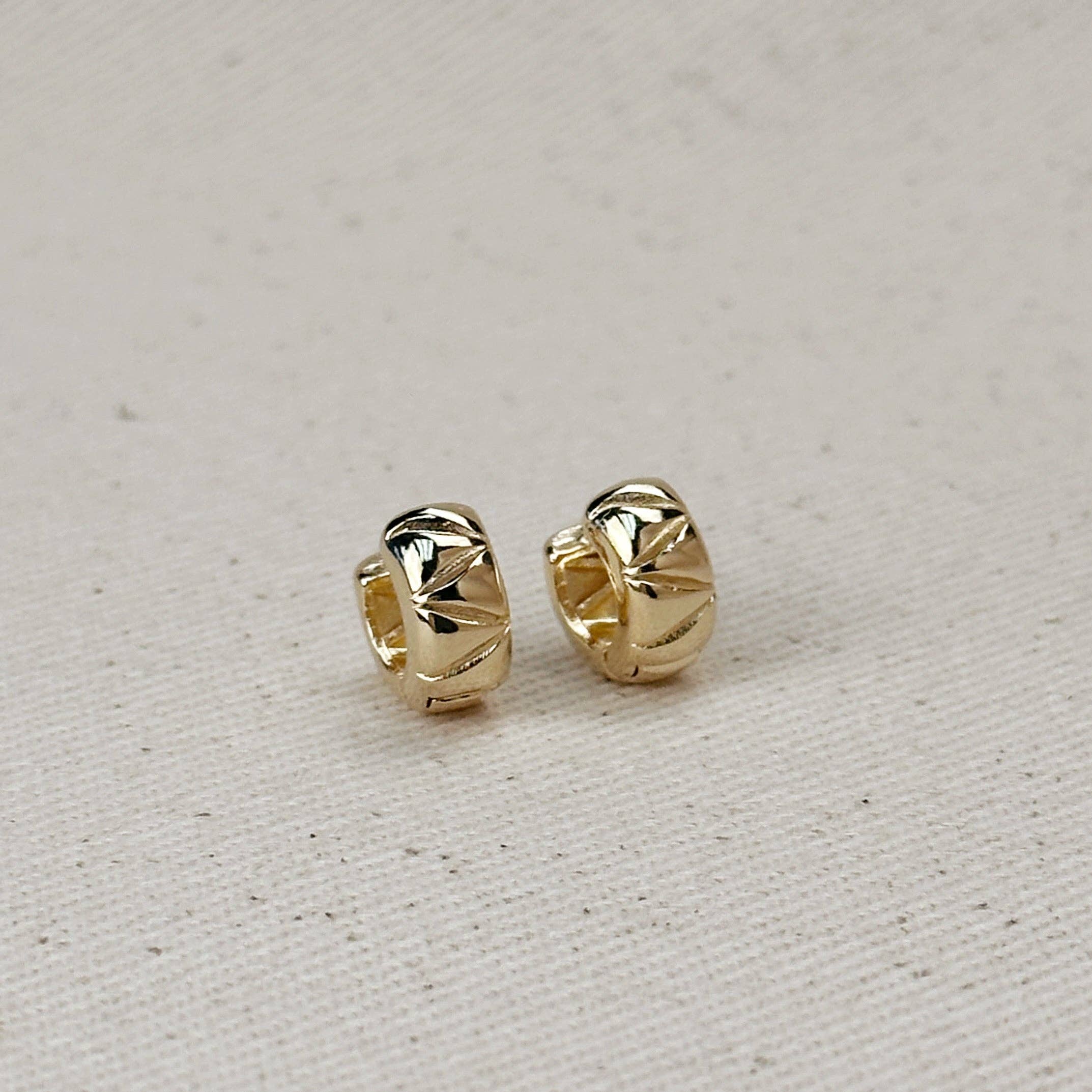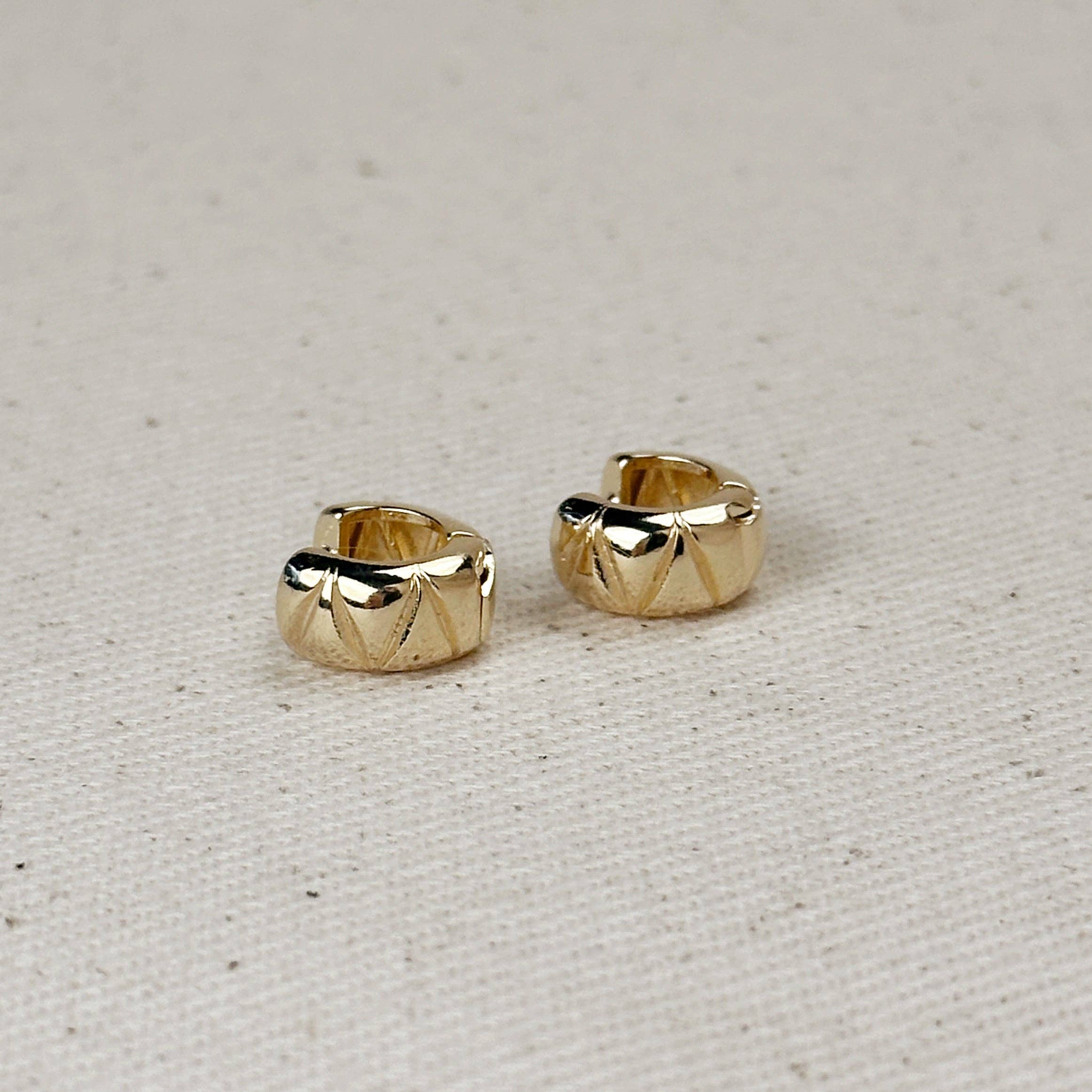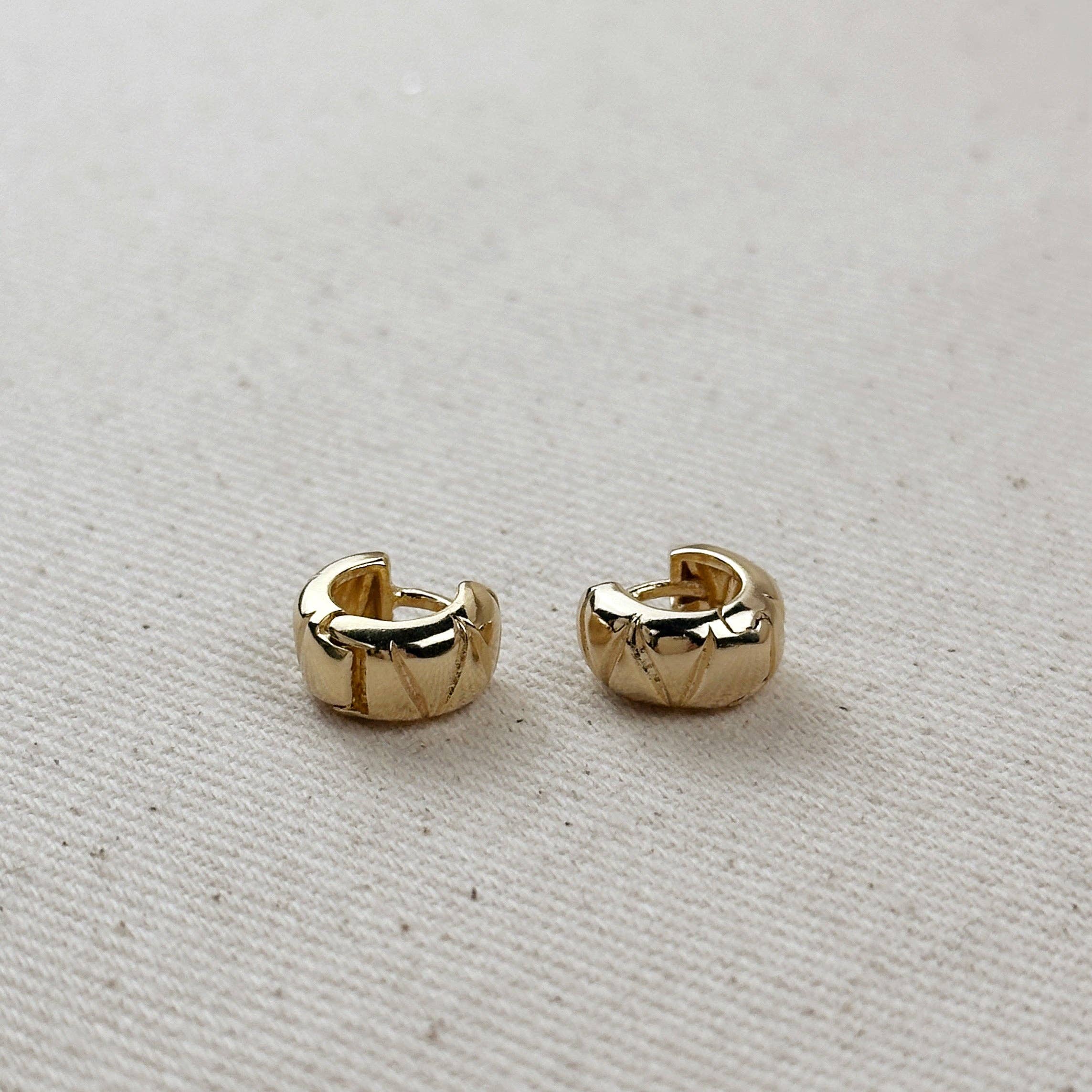 These 18k Gold Filled Diamond Cut Mini Chunky Hoop Earrings are a staple. The beautiful diamond cut design adds an edgy flair to these classic hoops, making them the perfect accessory for any occasion.