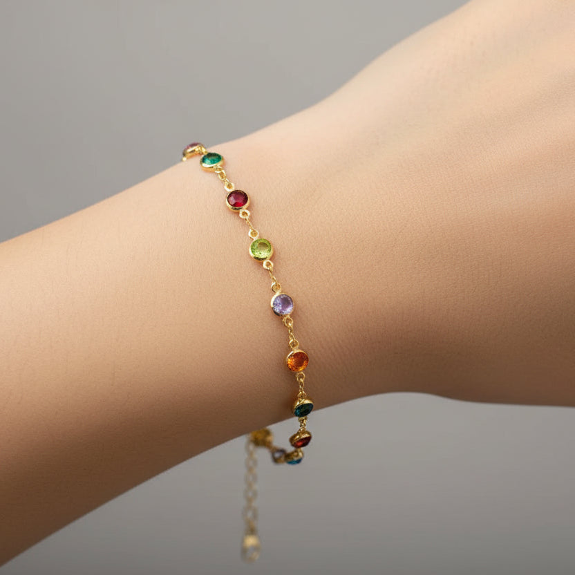 Add a vibrant pop of color and brilliant sparkle to your wrist. This elegant piece features a continuous line of meticulously cut, round cubic zirconia (CZ) stones in an array of captivating rainbow colors, set in a classic design. It's the perfect accessory to brighten your day and effortlessly elevate any outfit, from casual wear to evening glamour.