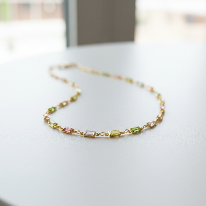This Pastel CZ Stone Necklace combines refined craftsmanship with accessible luxury. The cubic zirconia stones, selected for their soft pastel tones, deliver brilliance and clarity while remaining budget-conscious. Each stone is meticulously set in 18k gold filled—a durable material composed of a thick layer of gold bonded to a base metal core, ensuring longevity and resistance to tarnishing. The coordinating 18k gold filled chain provides structural integrity and a cohesive aesthetic. This piece is engineered for everyday wear, offering the sophisticated sparkle of fine jewelry without the investment. Ideal for those seeking quality craftsmanship and timeless design in a wearable, versatile necklace.