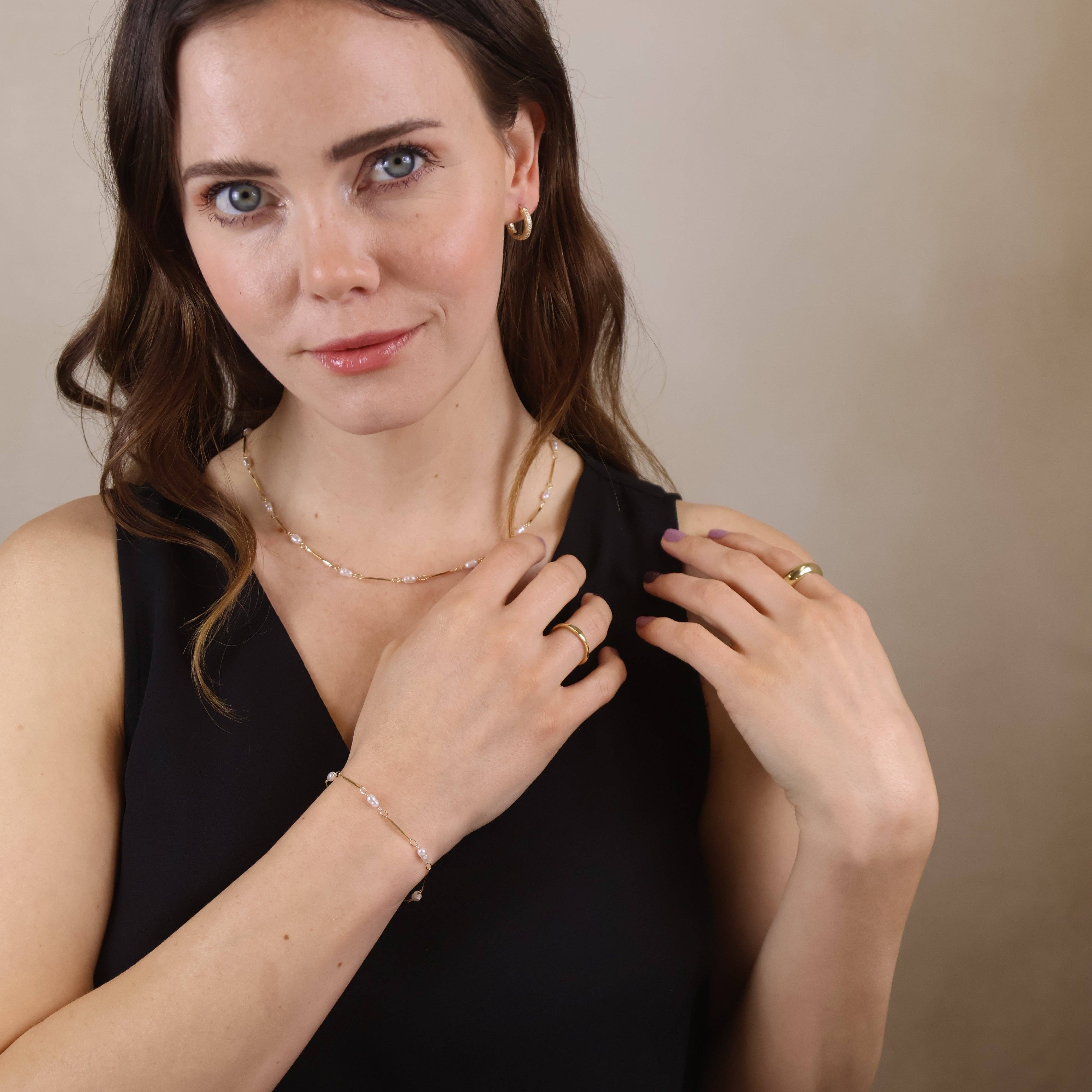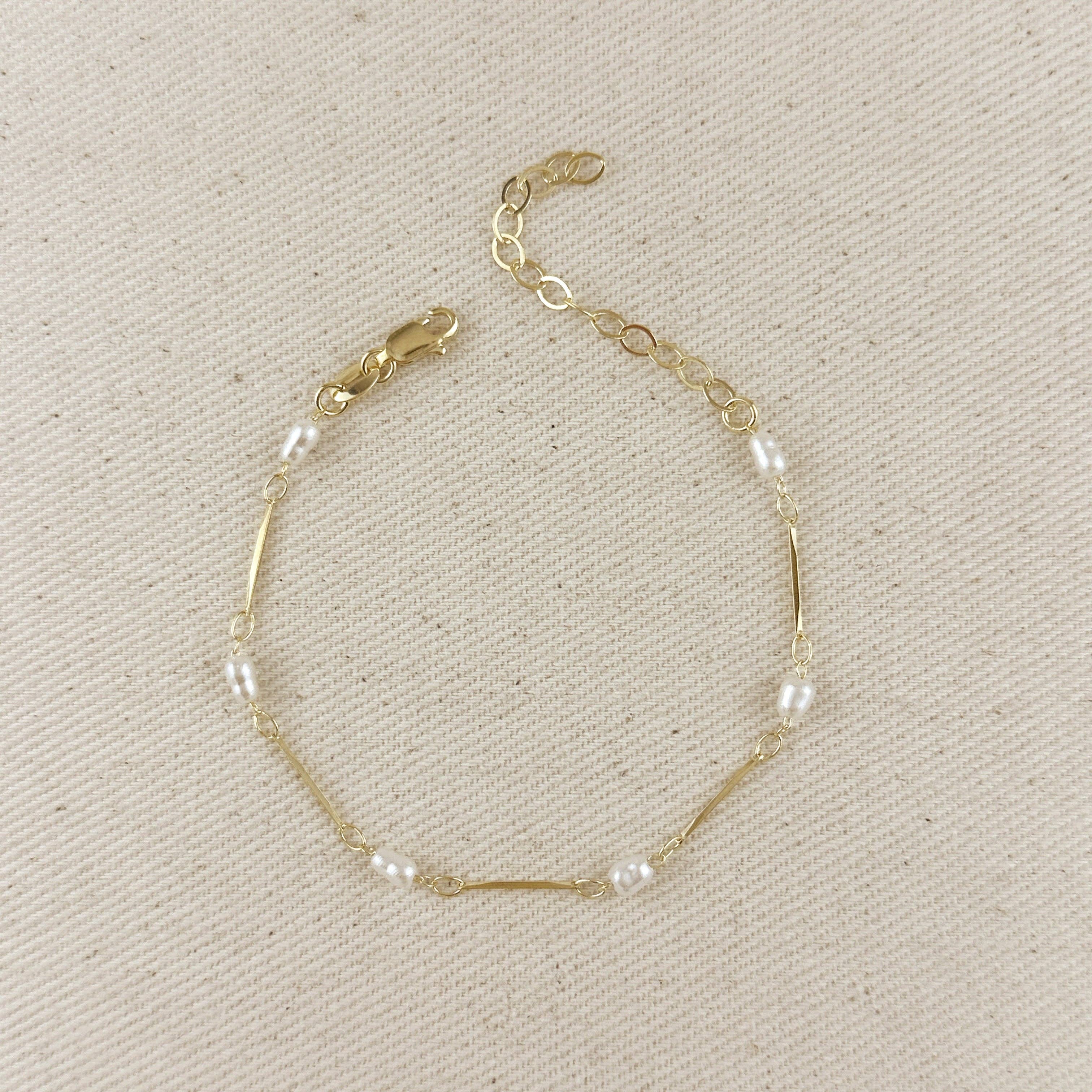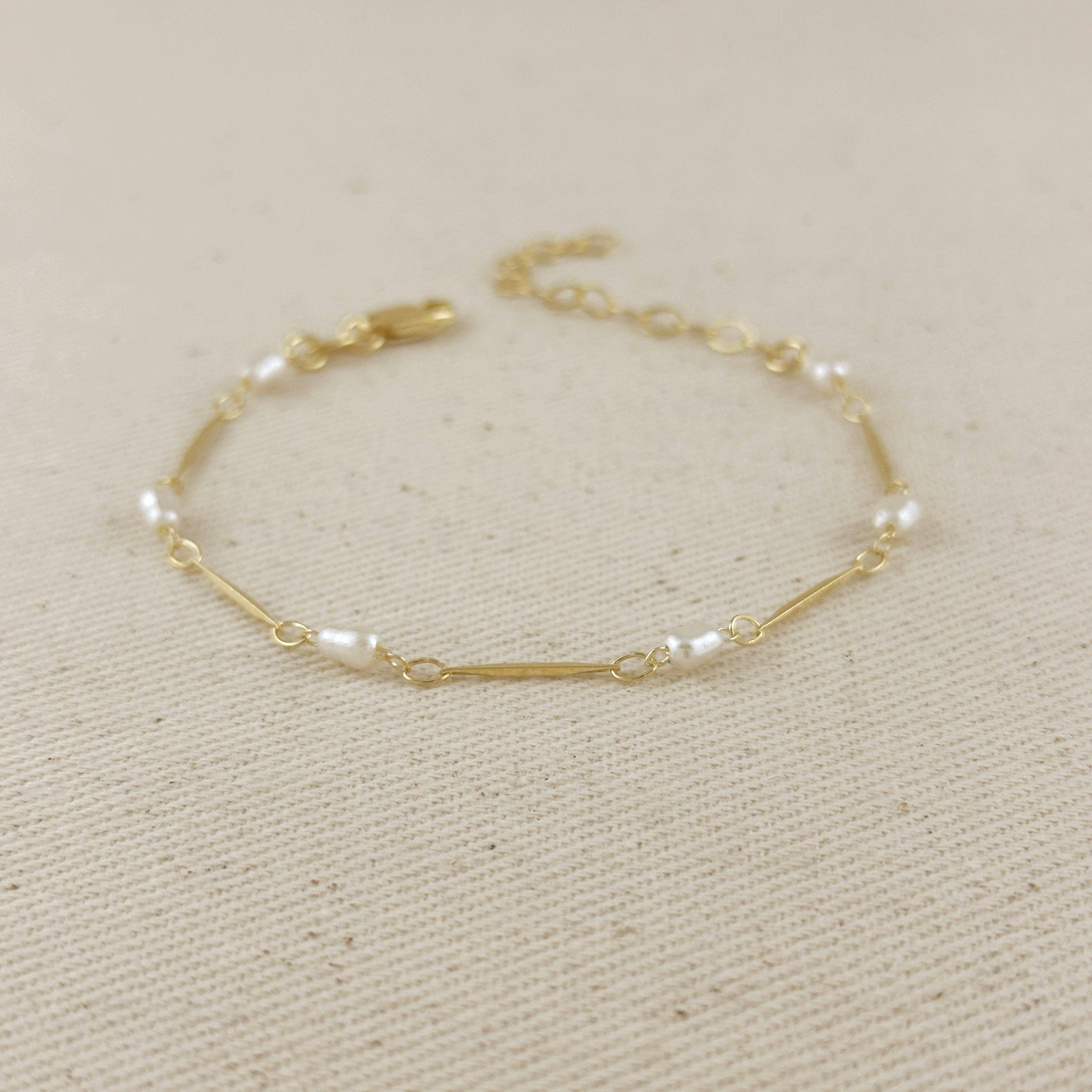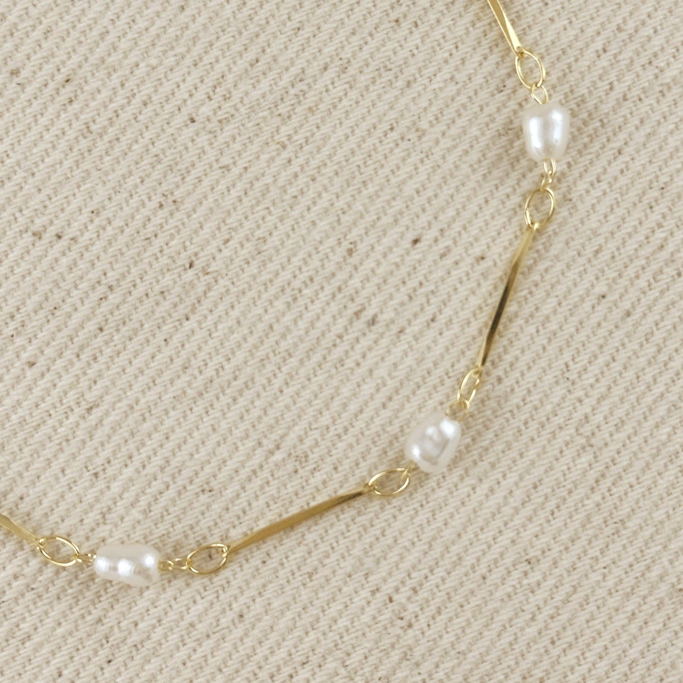 Elevate your everyday style with our elegant 18K Gold Filled Pearl Bead & Straw Bracelet. This delicate piece features lustrous synthetic pearl beads alternating with sleek gold-filled straw links, creating a timeless yet contemporary accessory. Each synthetic pearl is carefully crafted to capture the iridescent glow and asymmetry of natural baroque pearls. Versatile and refined, this bracelet transitions effortlessly from day to evening wear, adding a touch of sophistication to any outfit. The perfect gift for yourself or someone special who appreciates subtle luxury.