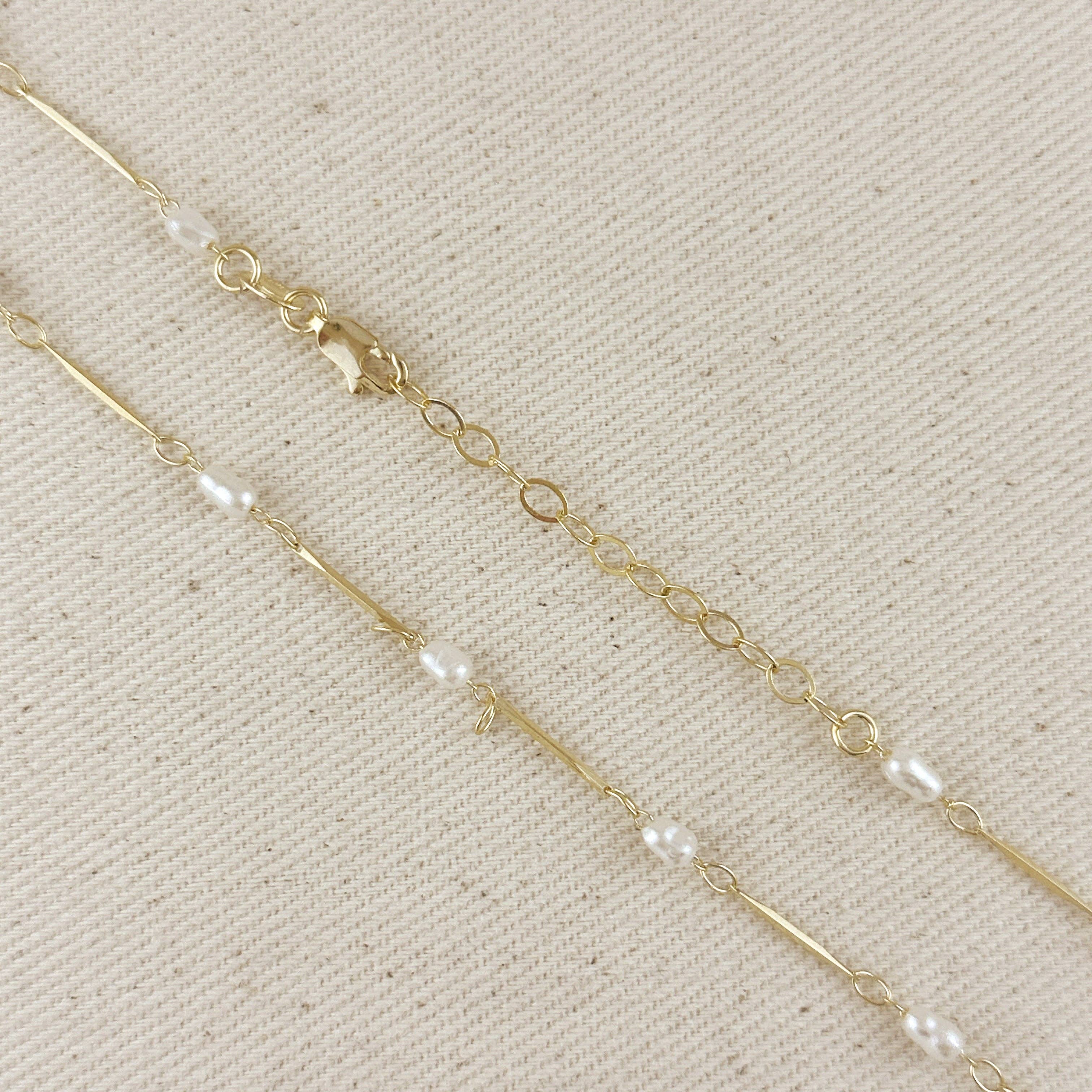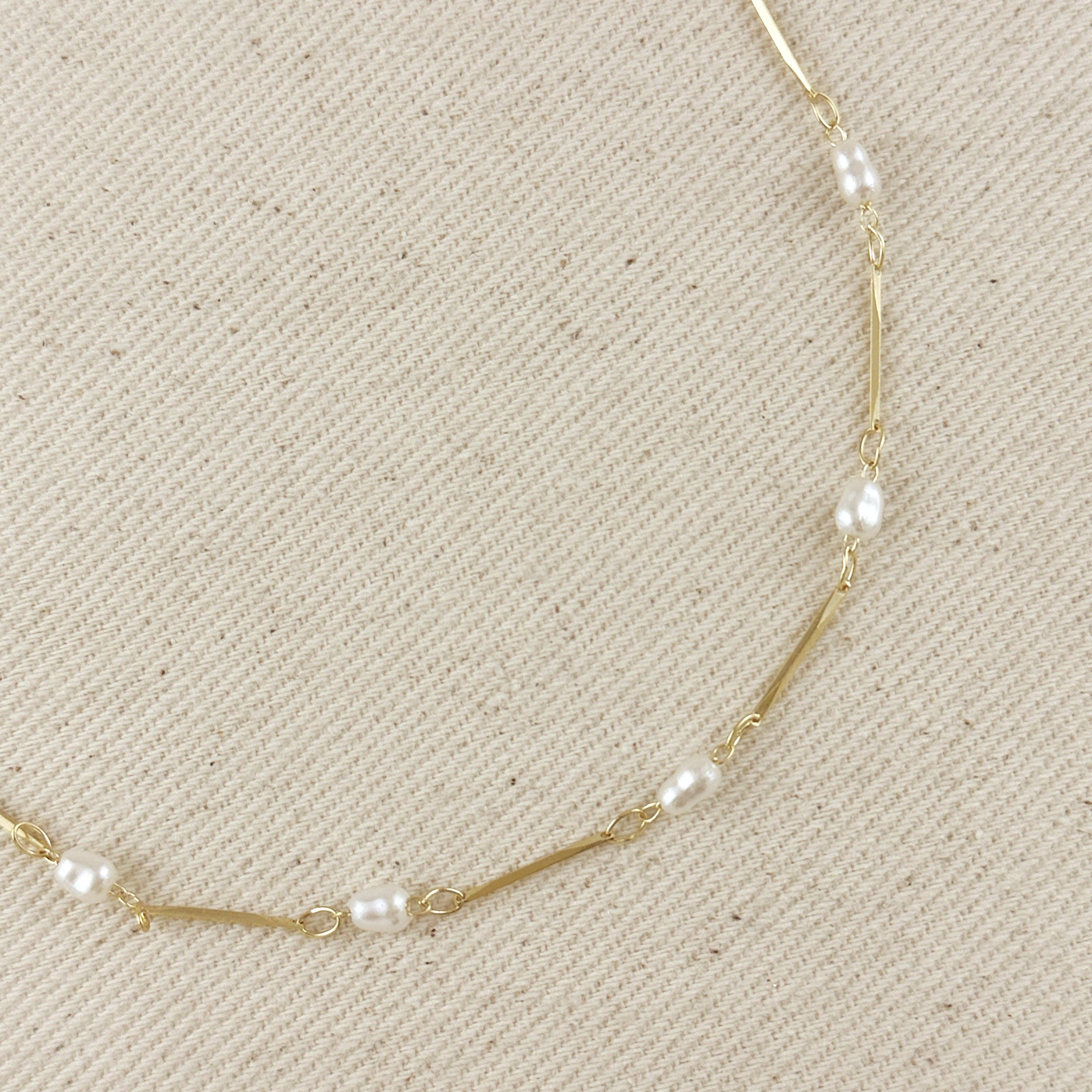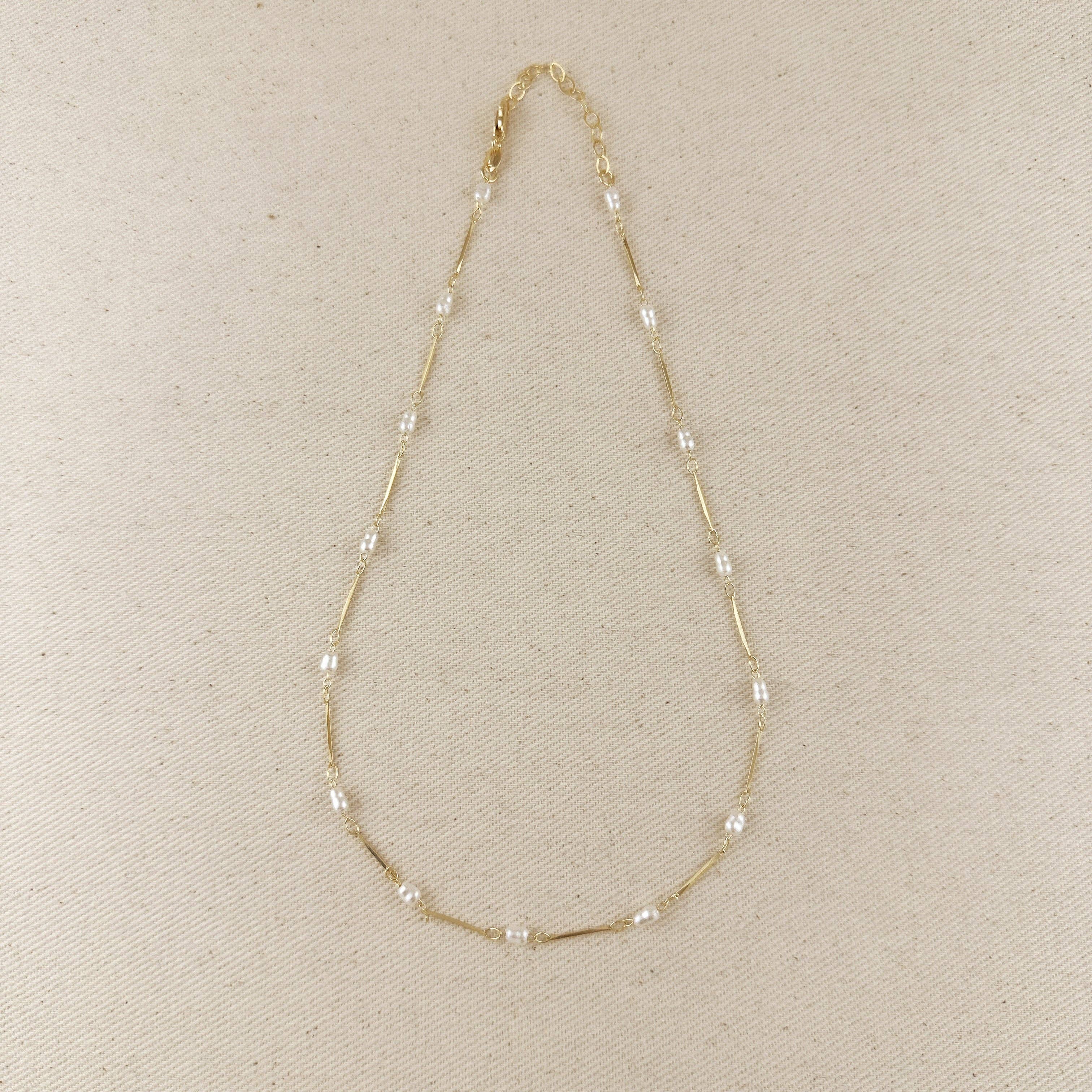 Elevate your neckline with our stunning 18K Gold Filled Pearl Bead & Straw Necklace. This sophisticated piece features the same exquisite craftsmanship, with luminous synthetic pearl beads alternating with slender gold-filled straw components for a balanced, elegant look.
