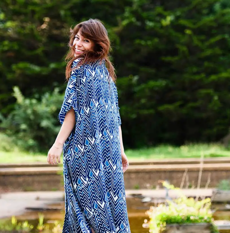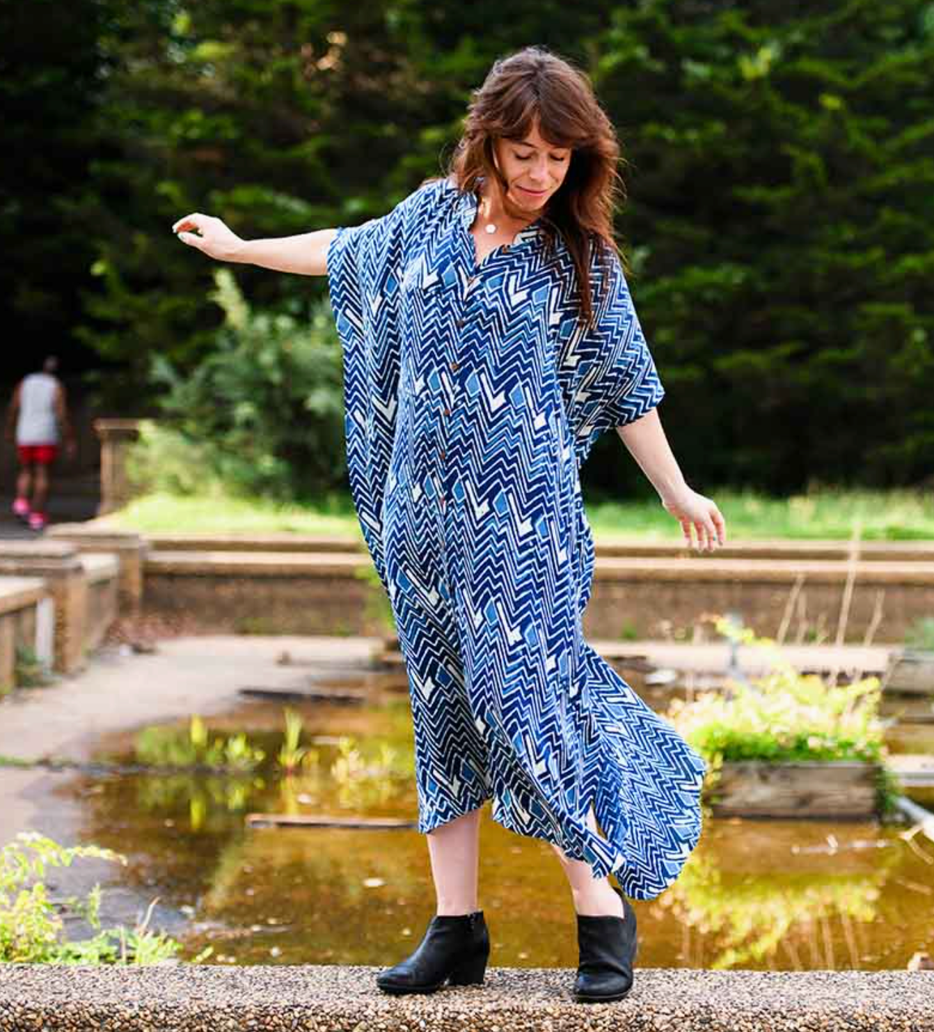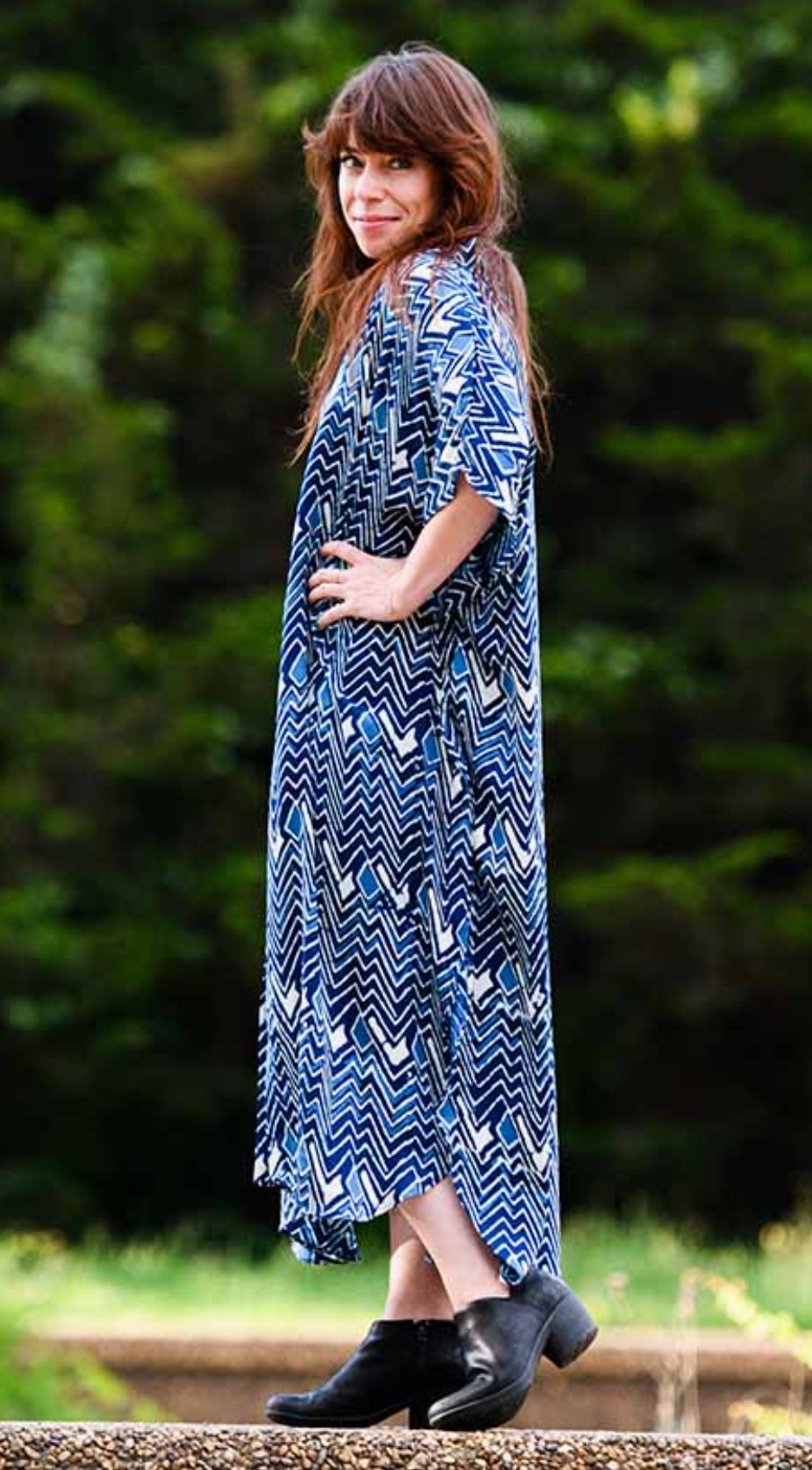 Blue: block printed using carved wooden blocks - hand dyed in natural dyes: Blues and White - fabric: 100% Modal - size: Length: 47" | fits sizes 0-20 (XS - 2XL) - 2 pockets! - buttons: made of coconut shells * Kris is 5'2" and wears a small/medium
