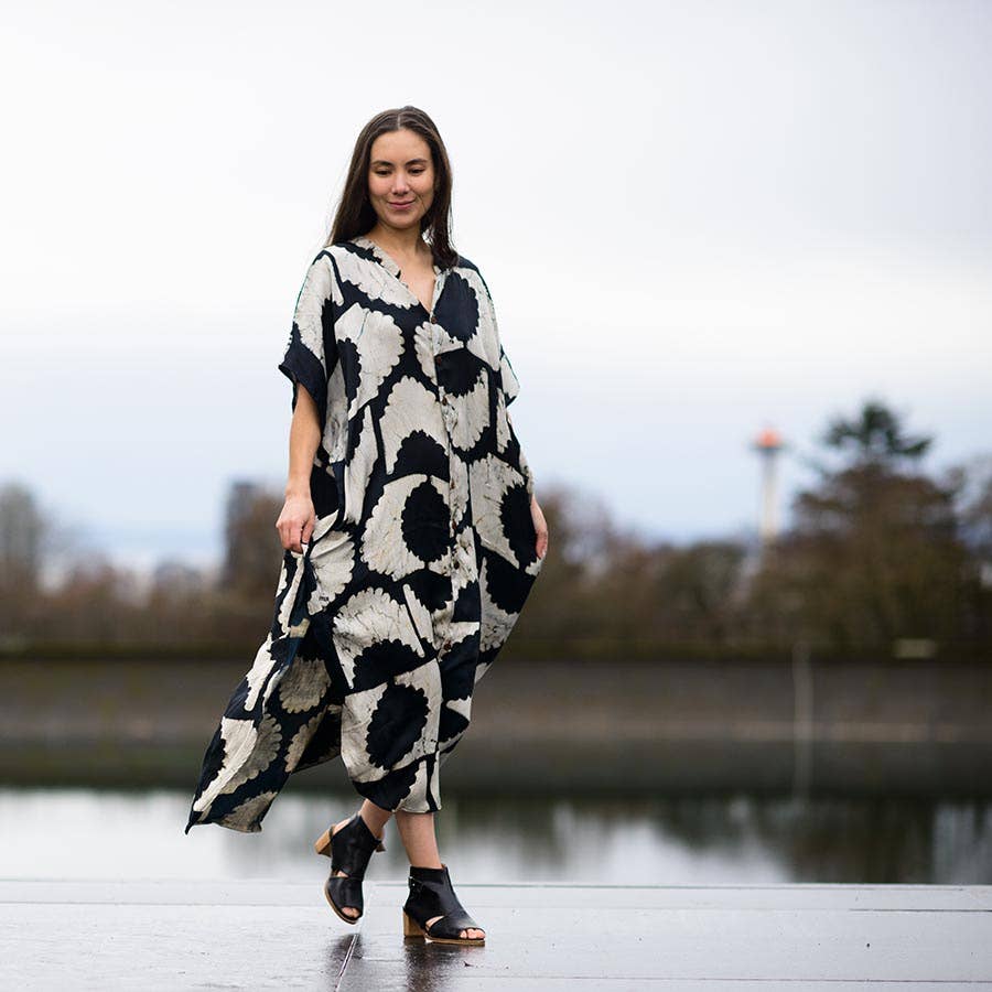 Black and white: This pattern was inspired by the silhouettes of Indian palace doorways created during sunsets. This light black and white dress, was block printed using the DABU technique, which is a mud resist. The dress is ever so soft and feels so luxurious to touch, and has pockets. The buttons are made of coconut shells - making it a perfectly sustainable dress. Style it up with a belt or wear it as is for a a more relaxed look. - printed using carved wooden block - dyed in natural dyes - color: black.