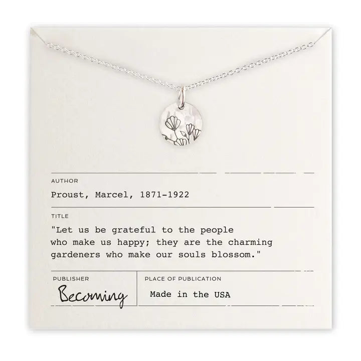 "Let us be grateful to the people who make us happy; they are the charming gardeners who make our souls blossom." -Marcel Proust On charm: Flowers Charm size: 1/2" Length: 18" fine cable chain Available metals: gold filled
