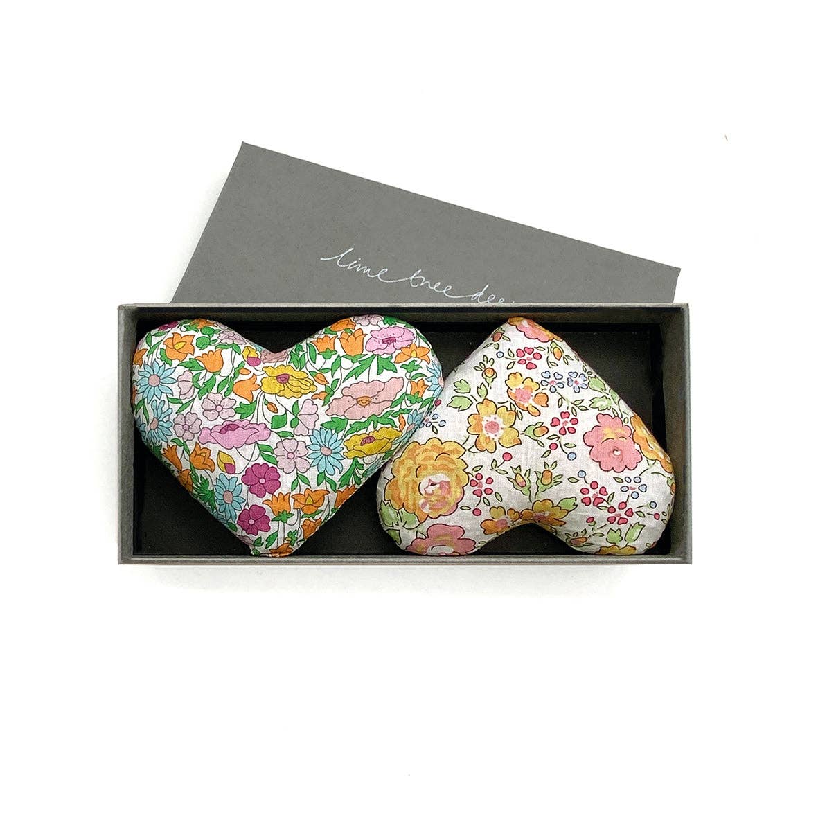 Box of 2 heart-shaped lavender drawer sachets. Handmade in Nottinghamshire studio from Liberty Tana Lawn fabric, the hearts are filled with fragrant lavender from Provence which lasts and lasts.