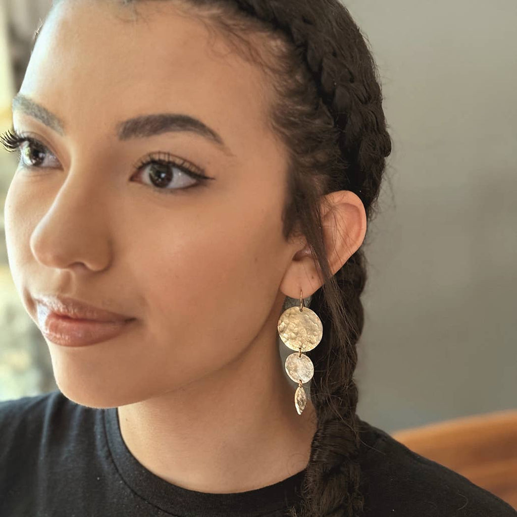 - Made of hammered brass with an anti-tarnish coating, 18k gold plated ear wires, lead and nickel free