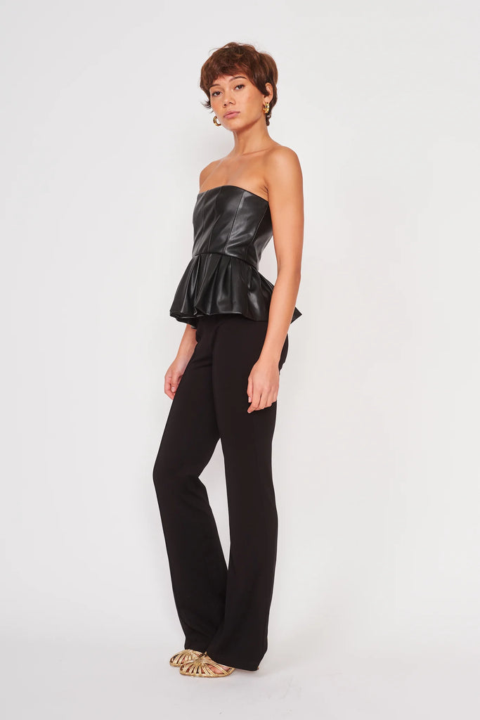 Make a bold statement with this black strapless peplum leatherette top, designed for a sleek and edgy night-out vibe. Featuring a flattering bodice seam detail that enhances your silhouette with a chic fit-and-flare shape, this top combines modern style with confidence-boosting design. Perfect for evening events where you want to stand out.