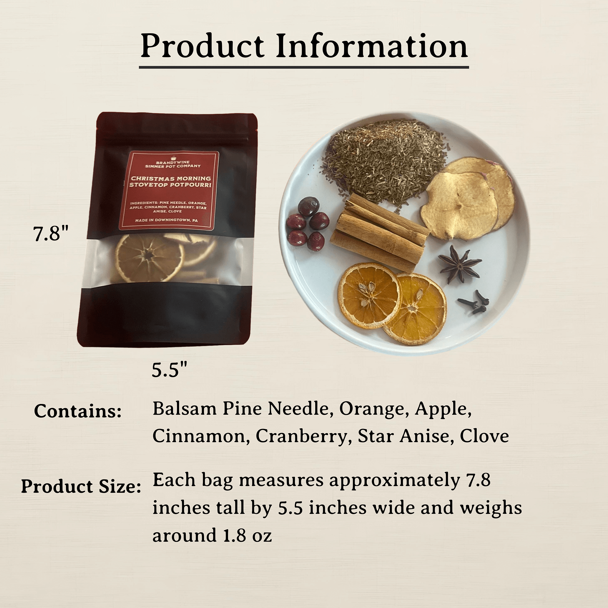 Dehydrated balsam pine needle, orange, apple, cinnamon, cranberry, star anise, and clove.