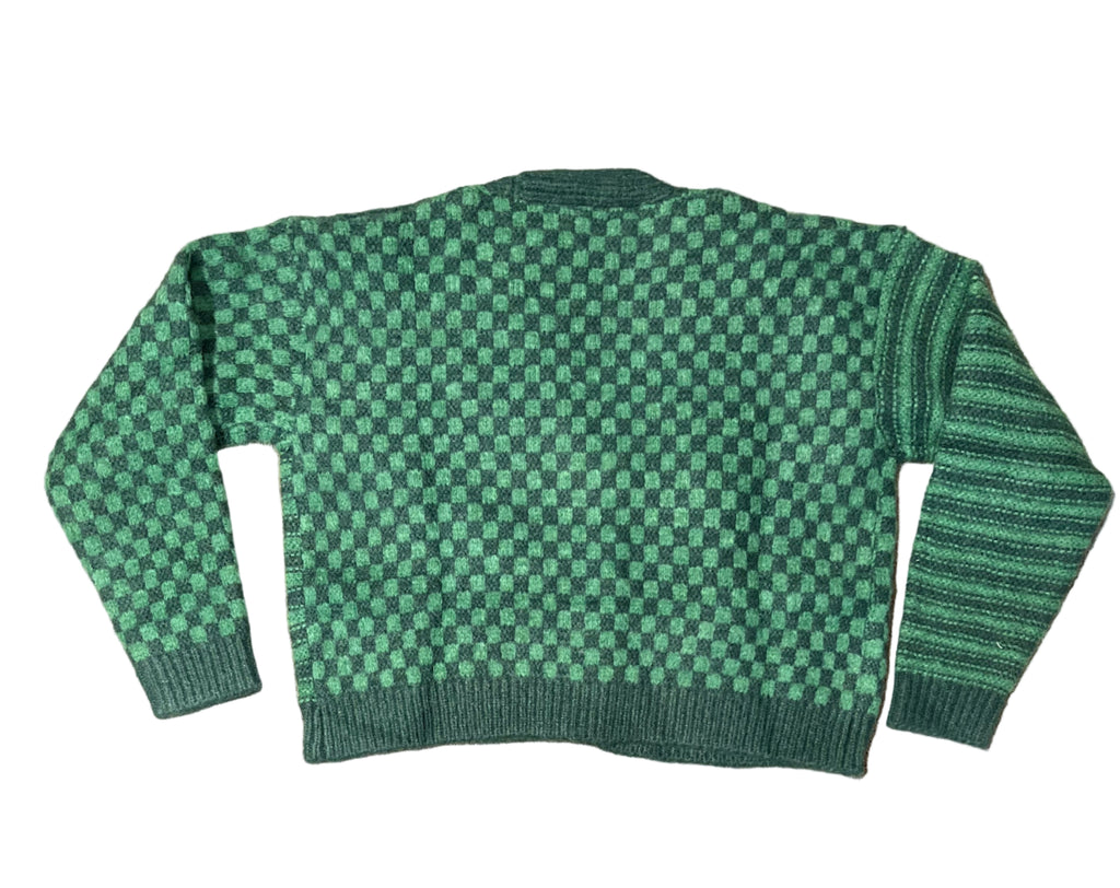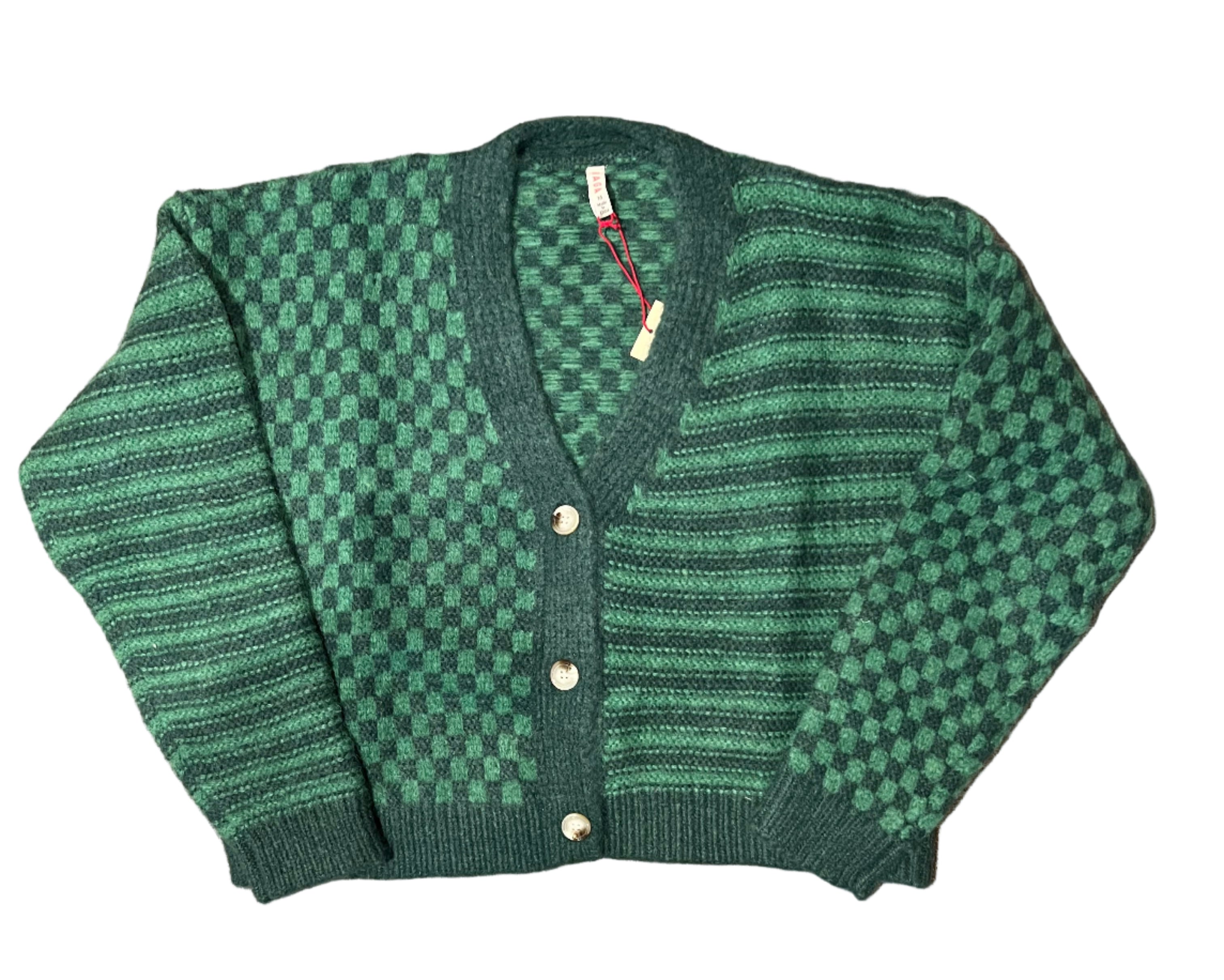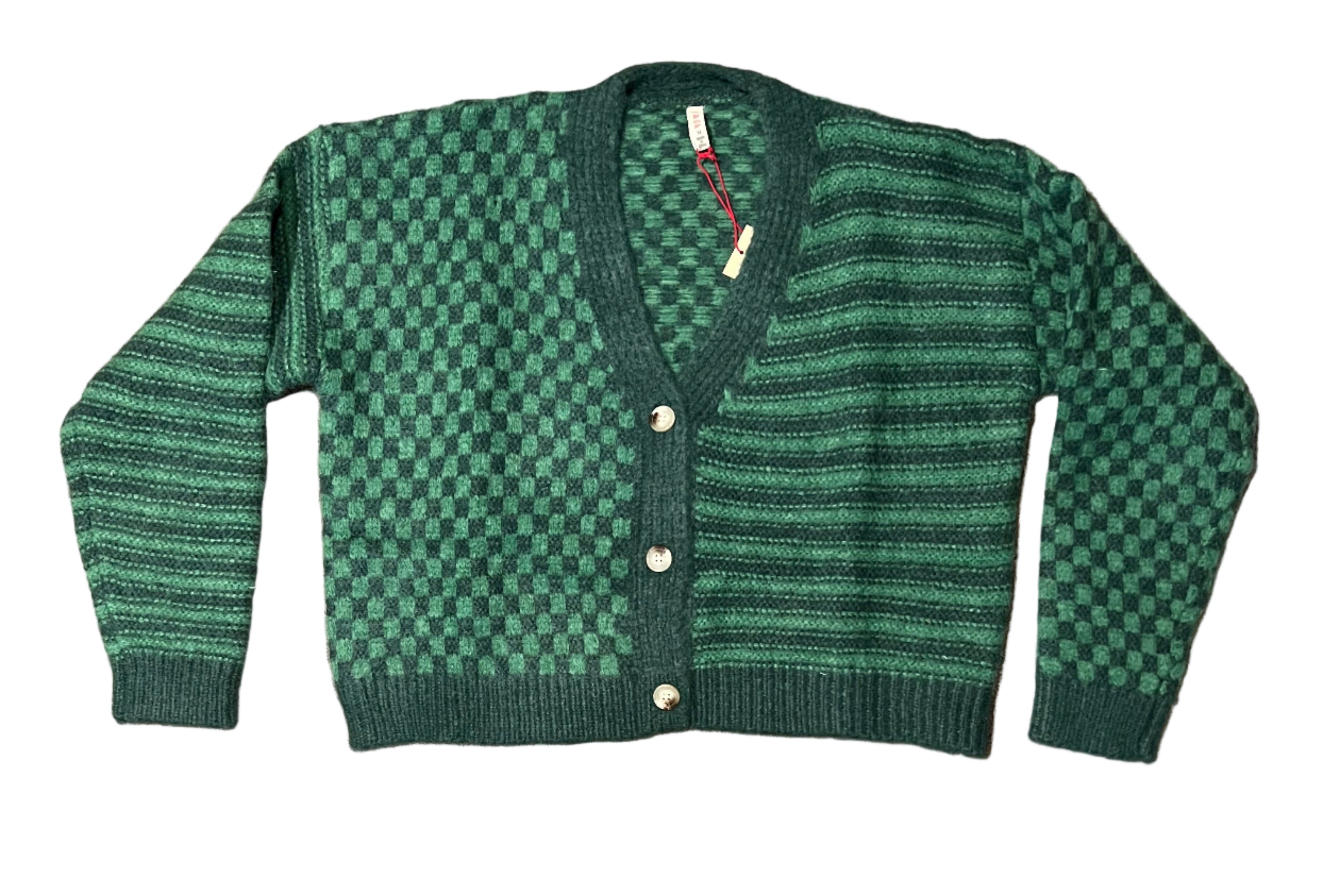 The Emerald City Cardigan brings a playful twist to cozy style with its semi-cropped fit and lively mix of checker and stripe patterns. Perfect for layering, this fun cardigan adds a vibrant pop to any outfit while keeping you comfortably warm all day long. Embrace bold style and comfy vibes in one unique piece!