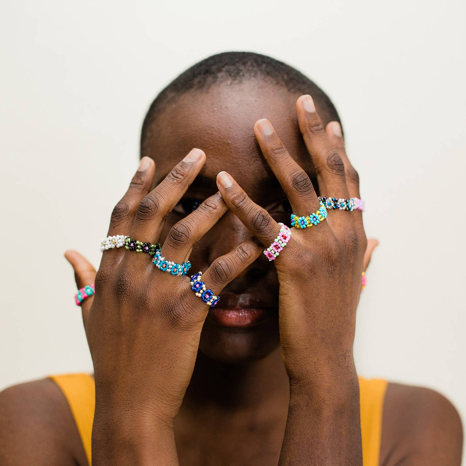 Add a touch of charm and color to your look with our handcrafted Flower Beaded Ring. Featuring a delicate daisy chain pattern that wraps around the entire circumference, this ring offers a playful and elegant way to dress up your fingers. Available in a variety of vibrant colors and sizes, each ring is made with attention to detail and love by skilled artisans in Guatemala.