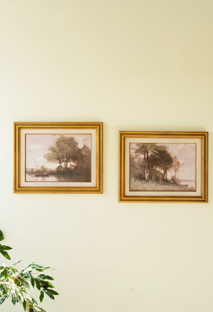 Bucolic scenes bring peaceful moments to chaotic lives. This set of two landscape prints under glass will calm your senses. Use them as part of a gallery wall or hang them side by side in your tranquil space