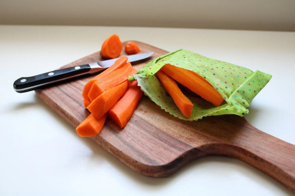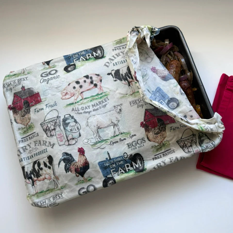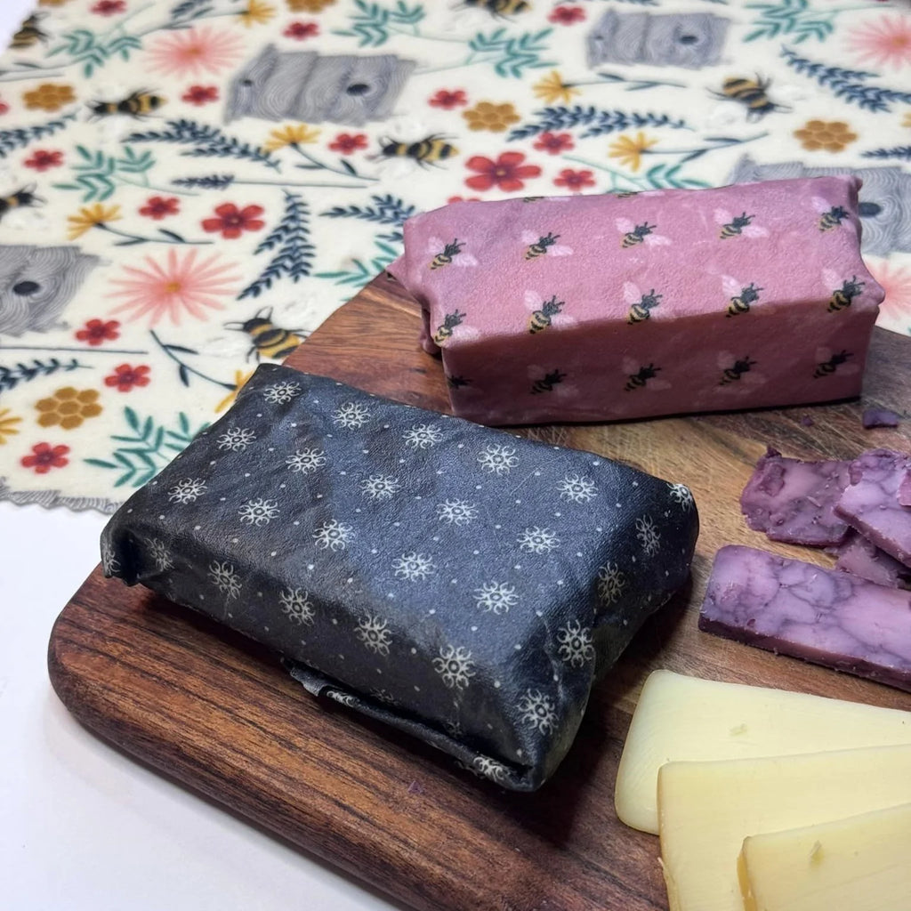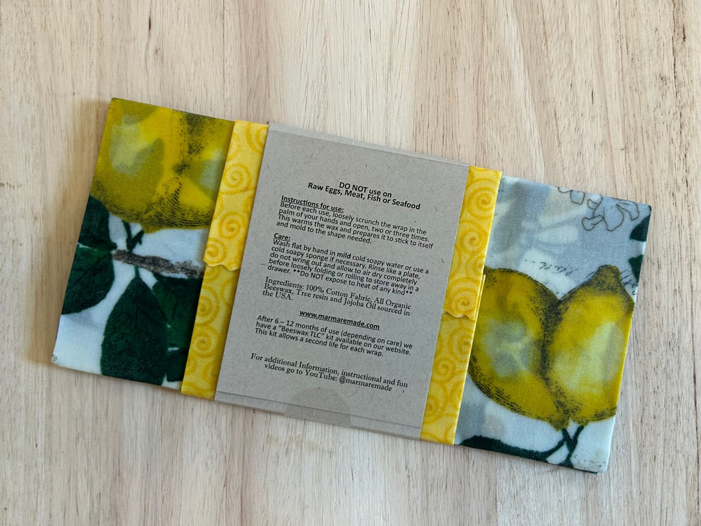 Beeswax reusable food wraps are an all-natural alternative to single use plastic baggies, wraps and aluminum foil. They are washable, reusable, last six months to a year and are ultimately biodegradable. They easily conform to any shape container, are a great replacement for missing lids or can be placed directly on food. By folding them in half and turning the edges you can create your own baggies.