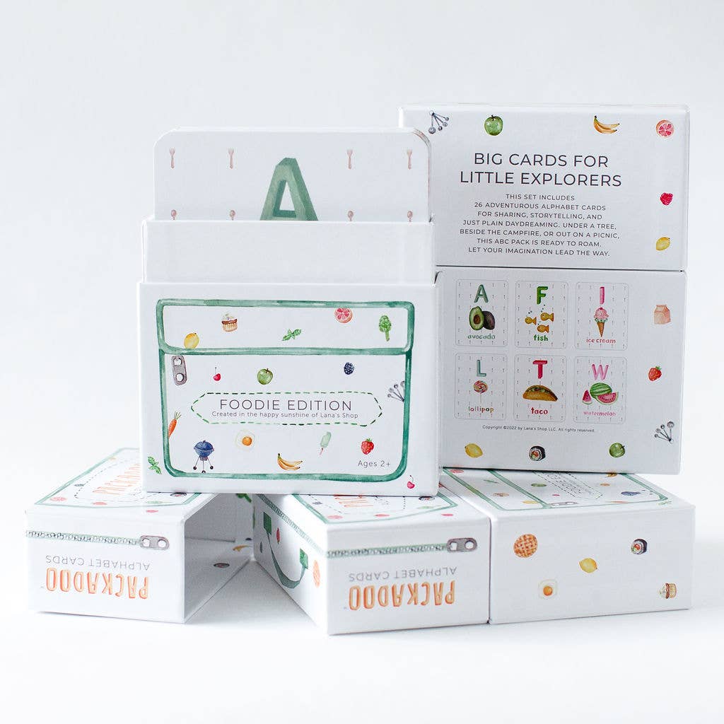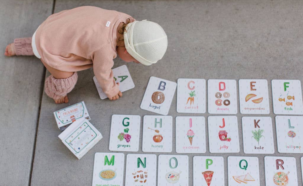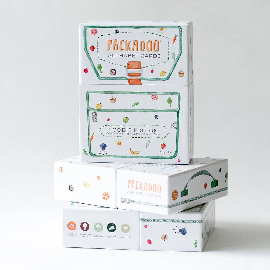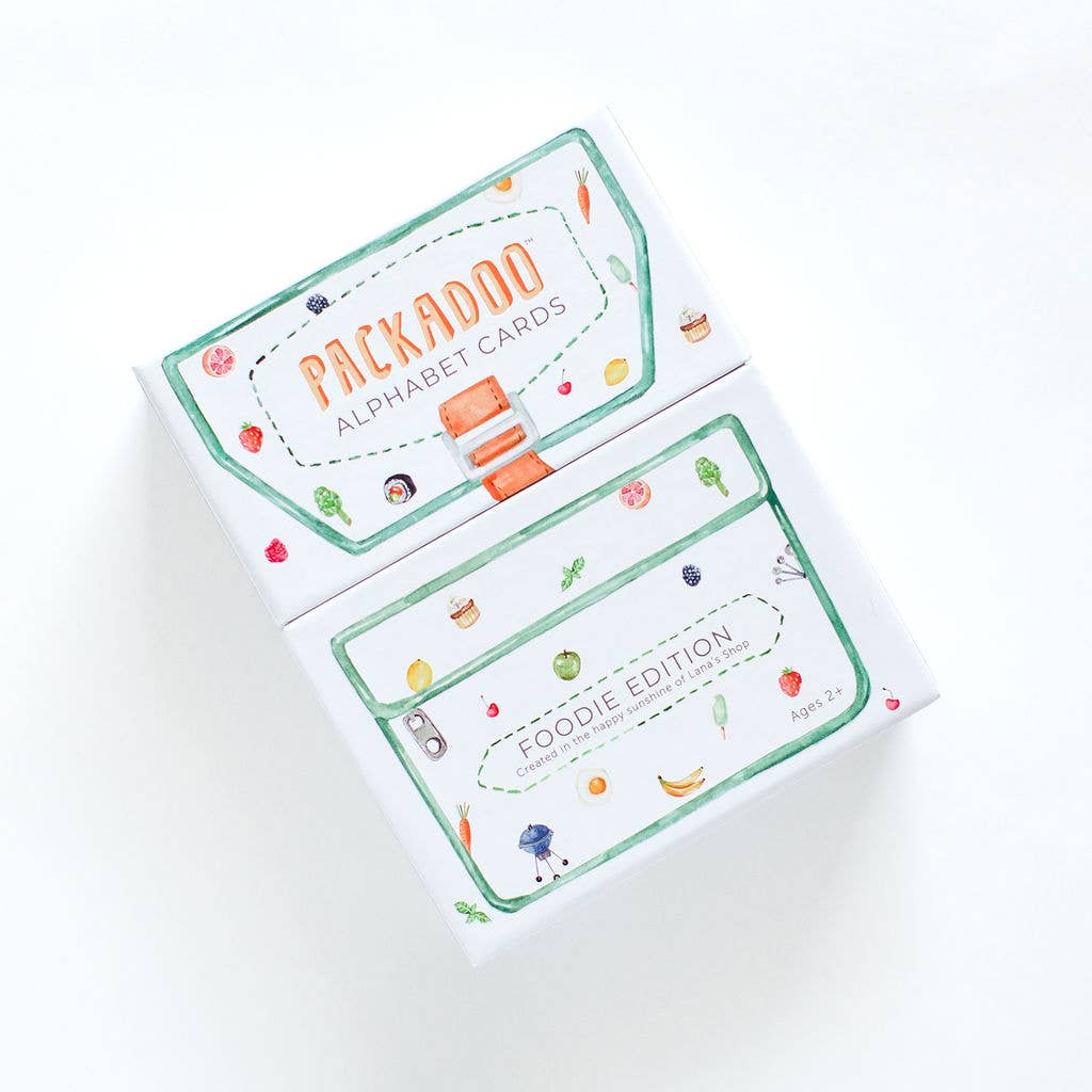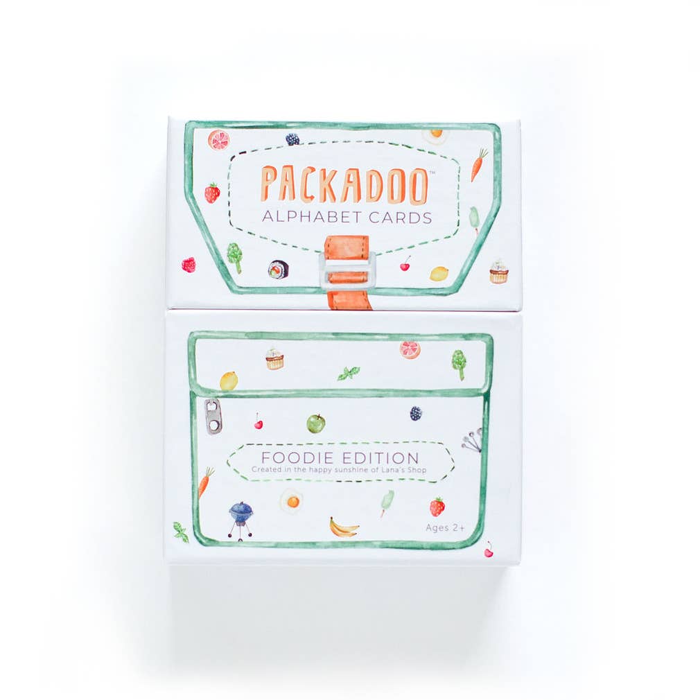 Foodie-themed alphabet flashcards! It’s a fresh selection of Packadoo alphabet cards that lets you play with your food, featuring hand-painted illustrations from avocado to zucchini. Kids recognize foods they love and discover new foods they’d like to try while learning all 26 letters in smart and snacky style. Packadoo is a perfect gift for baby showers and busy families who love to learn on the go—by flashlight, campfire, or summer sunshine. These durable, colorful ABC flashcards make learning an adventure, and they're sure to become sweet keepsakes to cherish. Packadoo is a cool tool kit for making words: Set includes 26 (A-Z) flash cards Each card is 4.25"x5.5" Double-sided design features original artwork Thick, durable, paper (Stomp-tested with gusto by Lana’s 2-year-old) Non-toxic Easy to wipe clean with a cloth Sturdy storage box Made in the USA Packed, with care in our Denver studio.