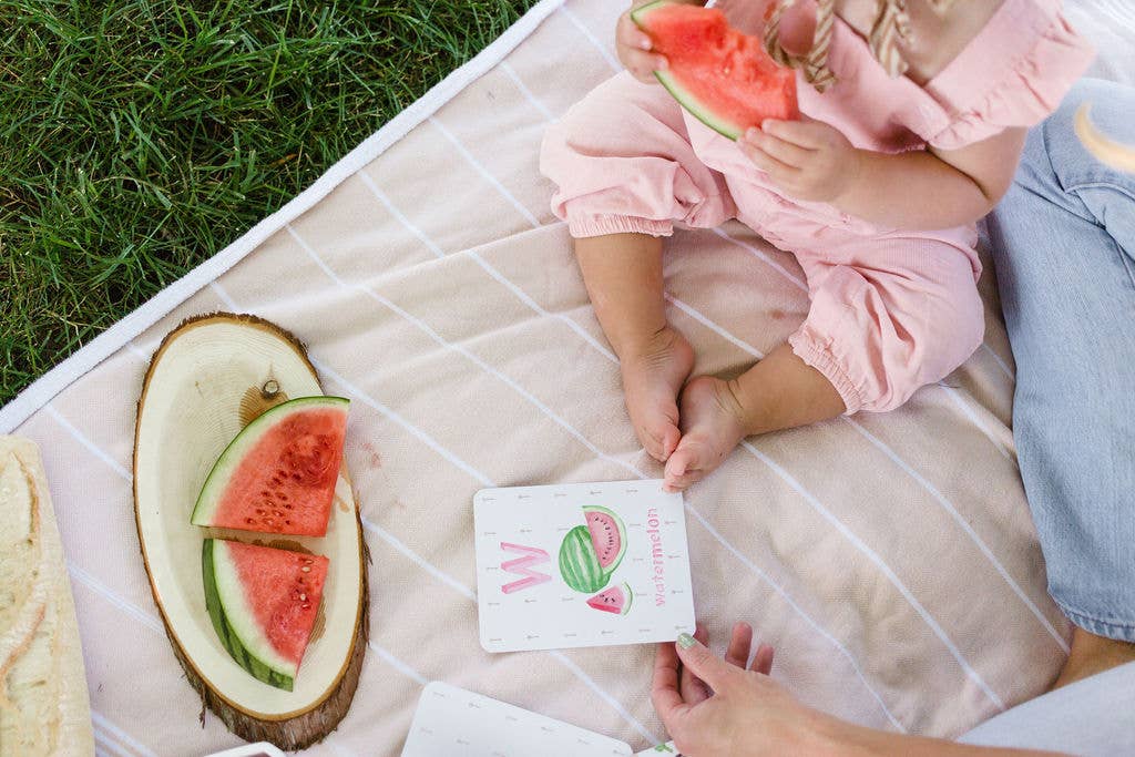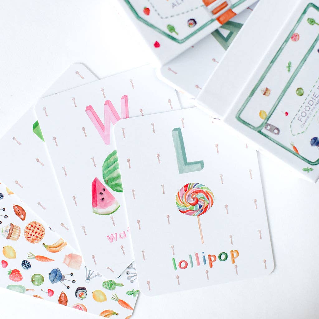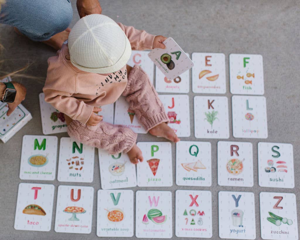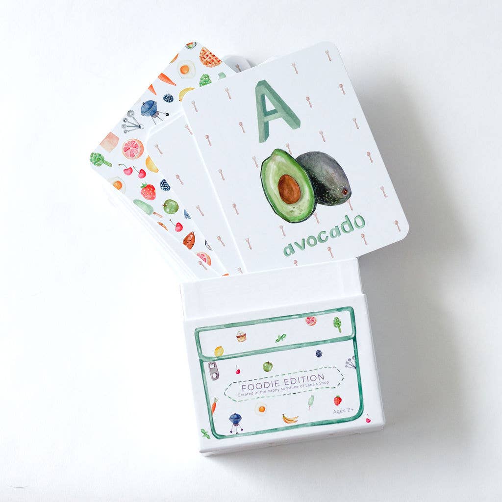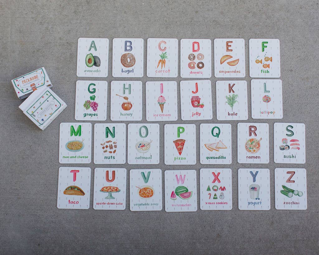 Foodie-themed alphabet flashcards! It’s a fresh selection of Packadoo alphabet cards that lets you play with your food, featuring hand-painted illustrations from avocado to zucchini. Kids recognize foods they love and discover new foods they’d like to try while learning all 26 letters in smart and snacky style. Packadoo is a perfect gift for baby showers and busy families who love to learn on the go—by flashlight, campfire, or summer sunshine. These durable, colorful ABC flashcards make learning an adventure, and they're sure to become sweet keepsakes to cherish. Packadoo is a cool tool kit for making words: Set includes 26 (A-Z) flash cards Each card is 4.25"x5.5" Double-sided design features original artwork Thick, durable, paper (Stomp-tested with gusto by Lana’s 2-year-old) Non-toxic Easy to wipe clean with a cloth Sturdy storage box Made in the USA Packed, with care in our Denver studio.