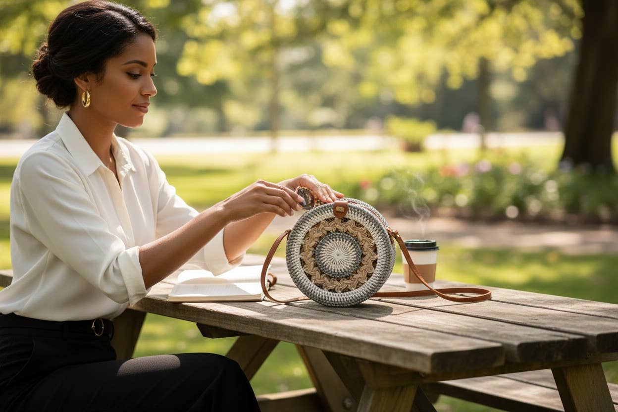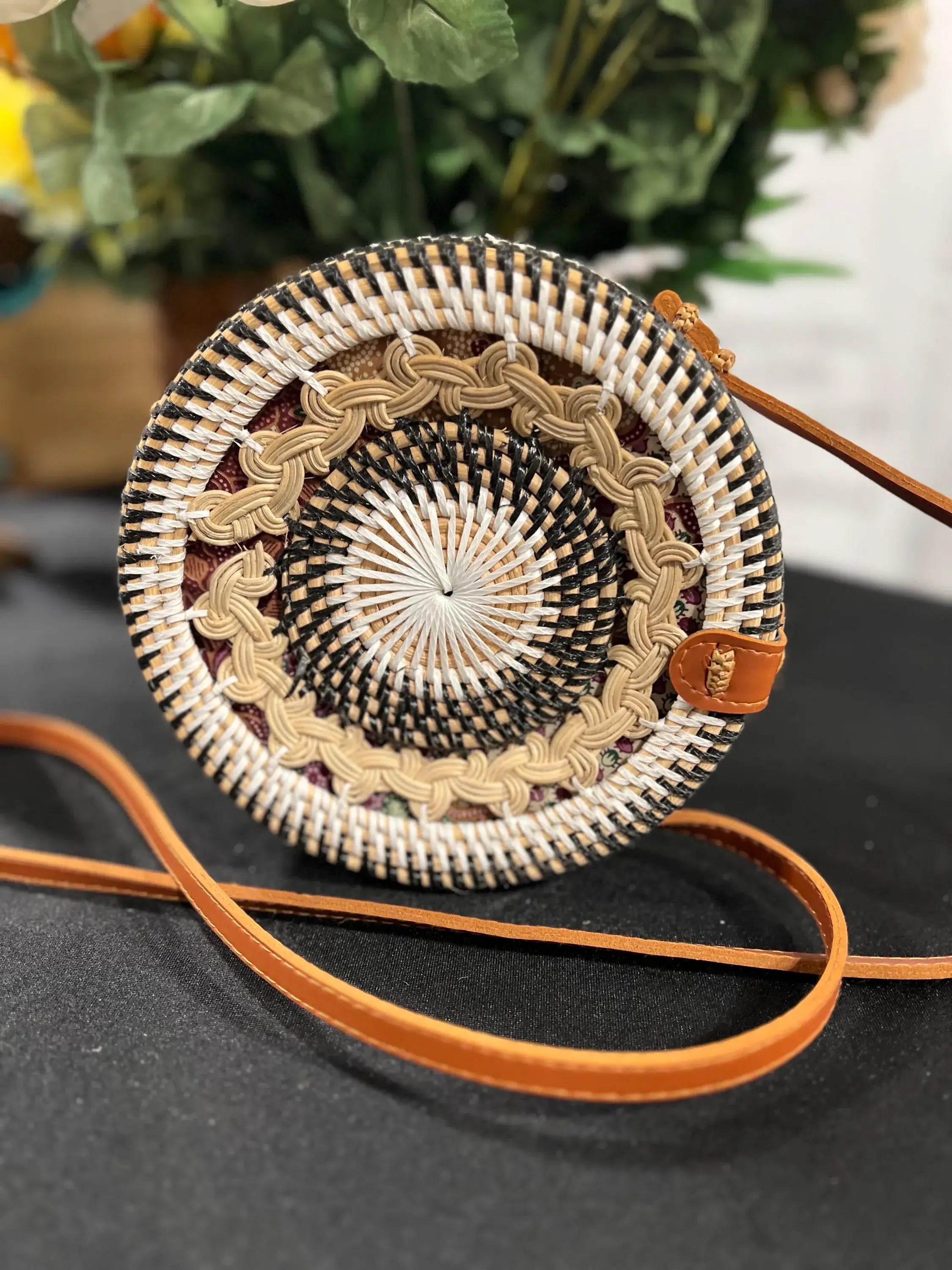 Timeless and on-trend, this Hand-Woven Round Rattan Crossbody Bag brings a natural boho flair to any look. Expertly crafted by artisans using sustainably sourced rattan, each bag is shaped into a sturdy circle and finished with a beautiful surprise inside—a traditional batik fabric lining that adds cultural richness and color. Lightweight yet durable, this compact crossbody is perfect for everyday adventures, festivals, or resort style. A secure clasp and long leather or faux leather strap complete the piece, making it a customer favorite for both function and fashion. An ideal accessory for conscious consumers seeking timeless style and handcrafted quality