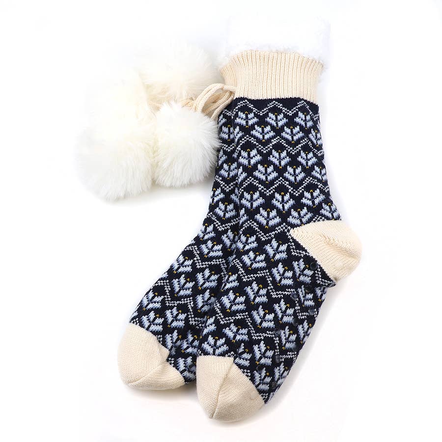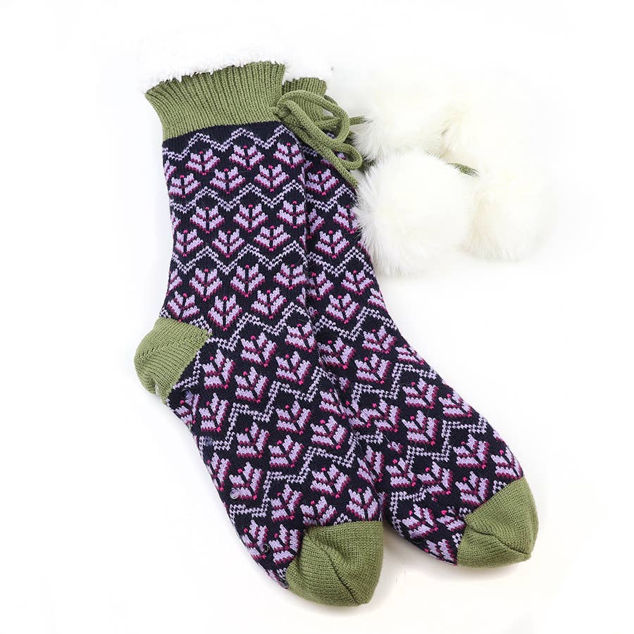 Sherpa lined and ready to cozy up! These slipper socks are the ultimate comfort companion for chilly days and lazy mornings. Crafted from a thoughtful blend of 50% recycled polyester, 20% nylon, 19% viscose, and 11% polyester. The plush sherpa lining wraps your feet in warmth while the adorable flower knit design adds a cheerful touch to your loungewear rotation. Whether you're padding around the house, settling in with a good book, or just embracing your cozy era, these socks keep your toes toasty. Sustainable comfort has never felt this good..