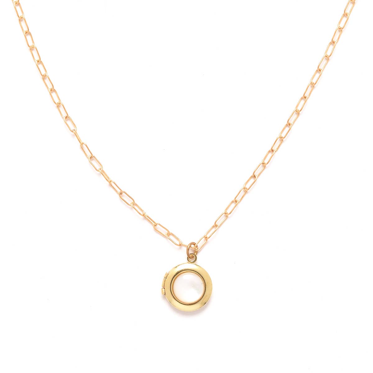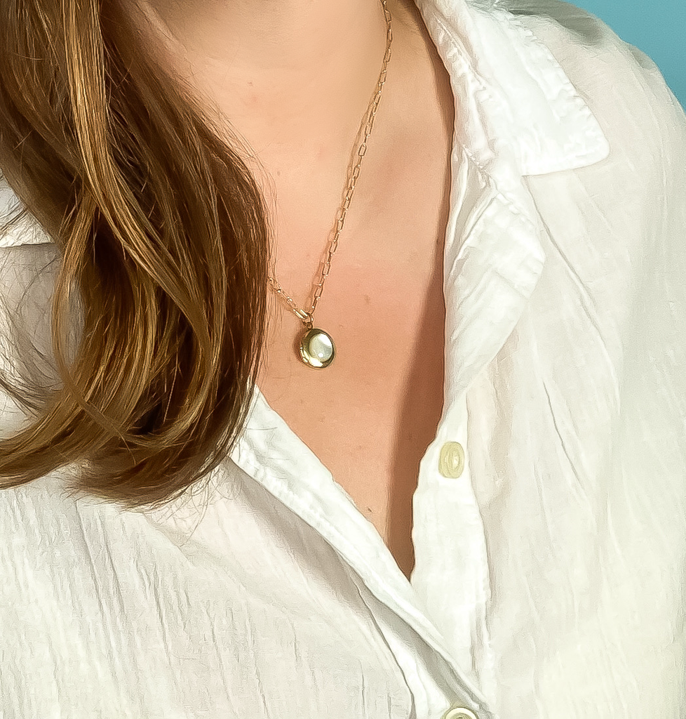 • Vintage brass round locket with a Mother of Pearl cabochon