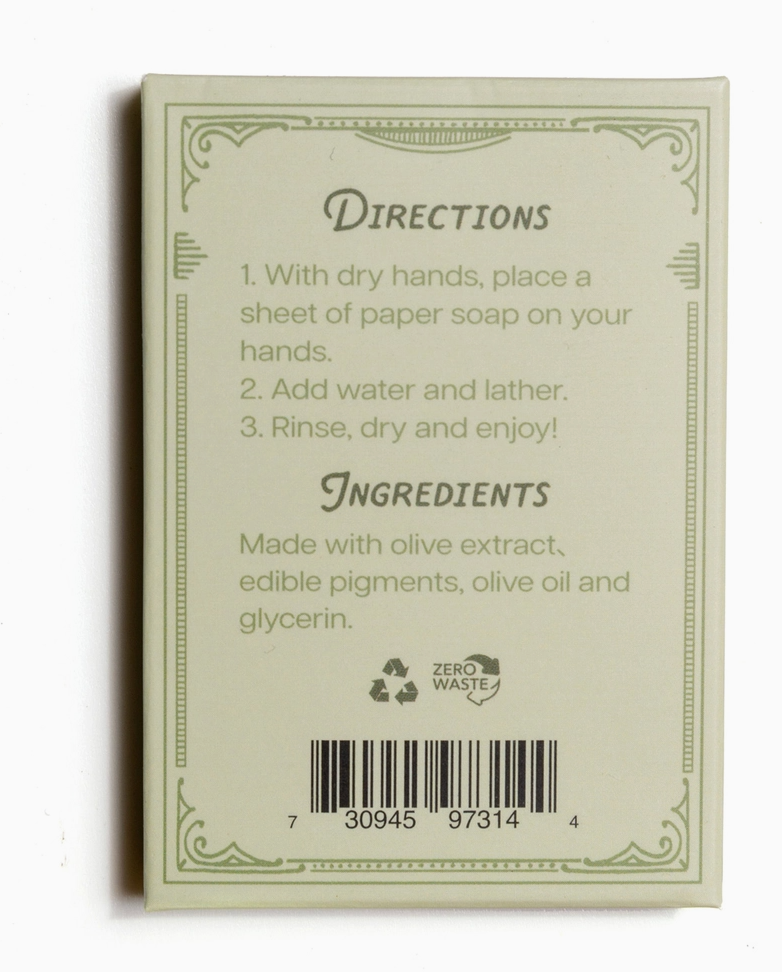 Directions: 1. Take a sheet of paper soap with dry hands. 2. Add water and lather thoroughly. 3. Rinse off, dry your hands, and enjoy!