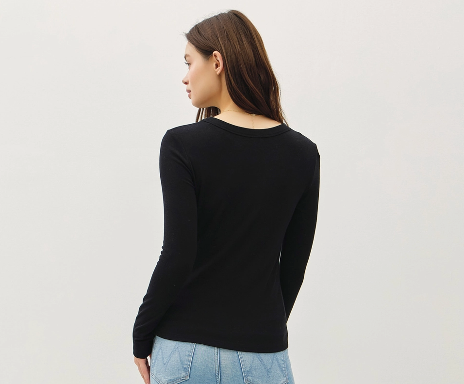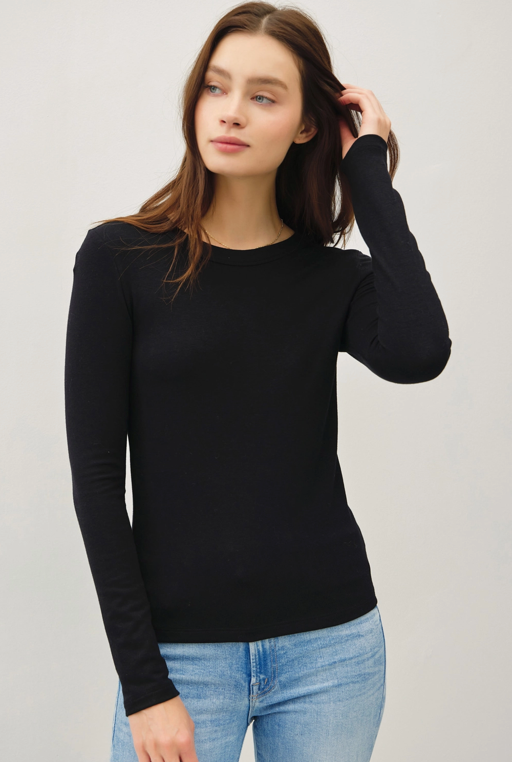 Slip into effortless style with this wardrobe MVP. Crafted from stretchy, buttery-soft ribbed cotton, it features a classic round neckline and long sleeves finished with charming cuff details. The relaxed slim fit flatters without fussing, making it perfect for layering or wearing solo. Whether you're building an outfit or keeping it simple, this essential top does the heavy lifting—comfort and versatility rolled into one.
