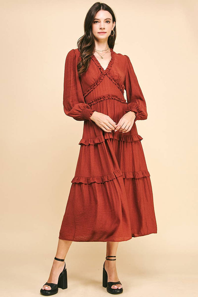 Twirl into elegance with this charming midi dress that's equal parts sophisticated and fun. The flattering V-neckline frames your face beautifully, while cascading ruffled tiers add movement and dimension to every step. Balloon sleeves with smocking at the cuffs bring a whimsical touch that feels both vintage-inspired and refreshingly modern. Perfect for brunch dates, garden parties, or whenever you want to feel effortlessly put-together with a dash of playful style.