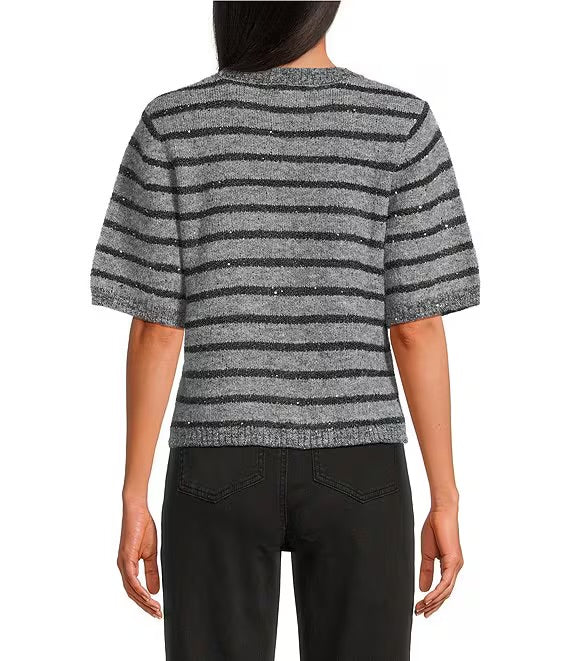 Stripes never go out of style—especially when they're paired with this cozy pullover! Featuring a classic crew neckline and short sleeves, this piece is ready for anything. The ribbed details at the neckline and cuffs keep everything snug and polished, while the approx. 21" length hits just right. Crafted from a premium polyester, nylon, and wool blend, it's built to last. Hand wash cold and line dry to keep it looking fresh season after season.