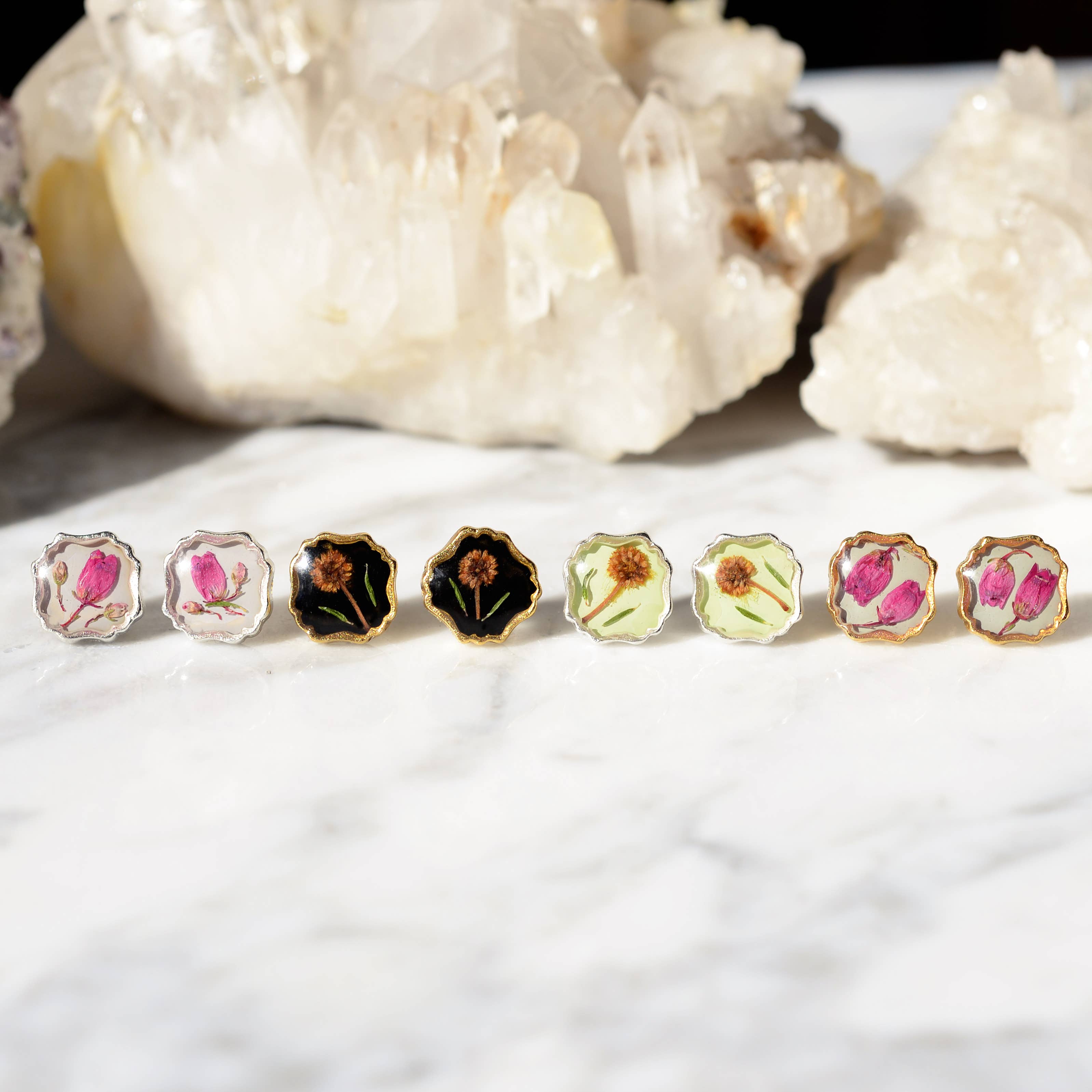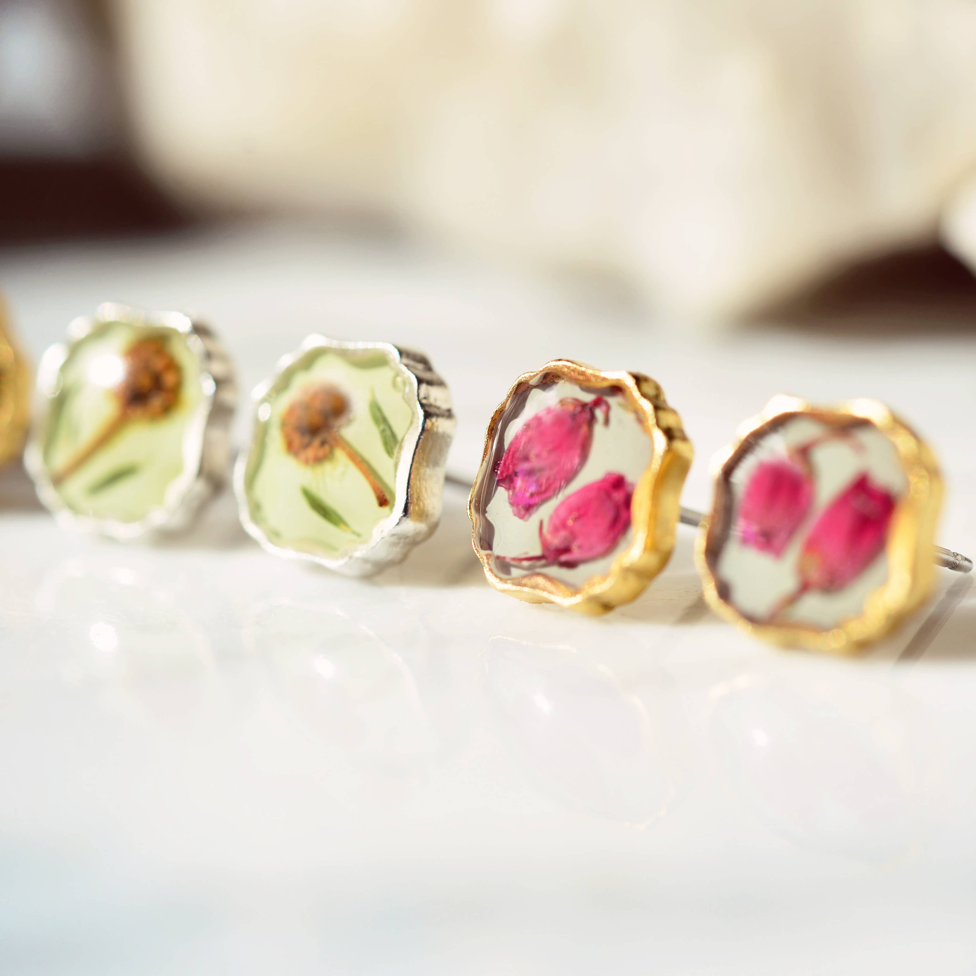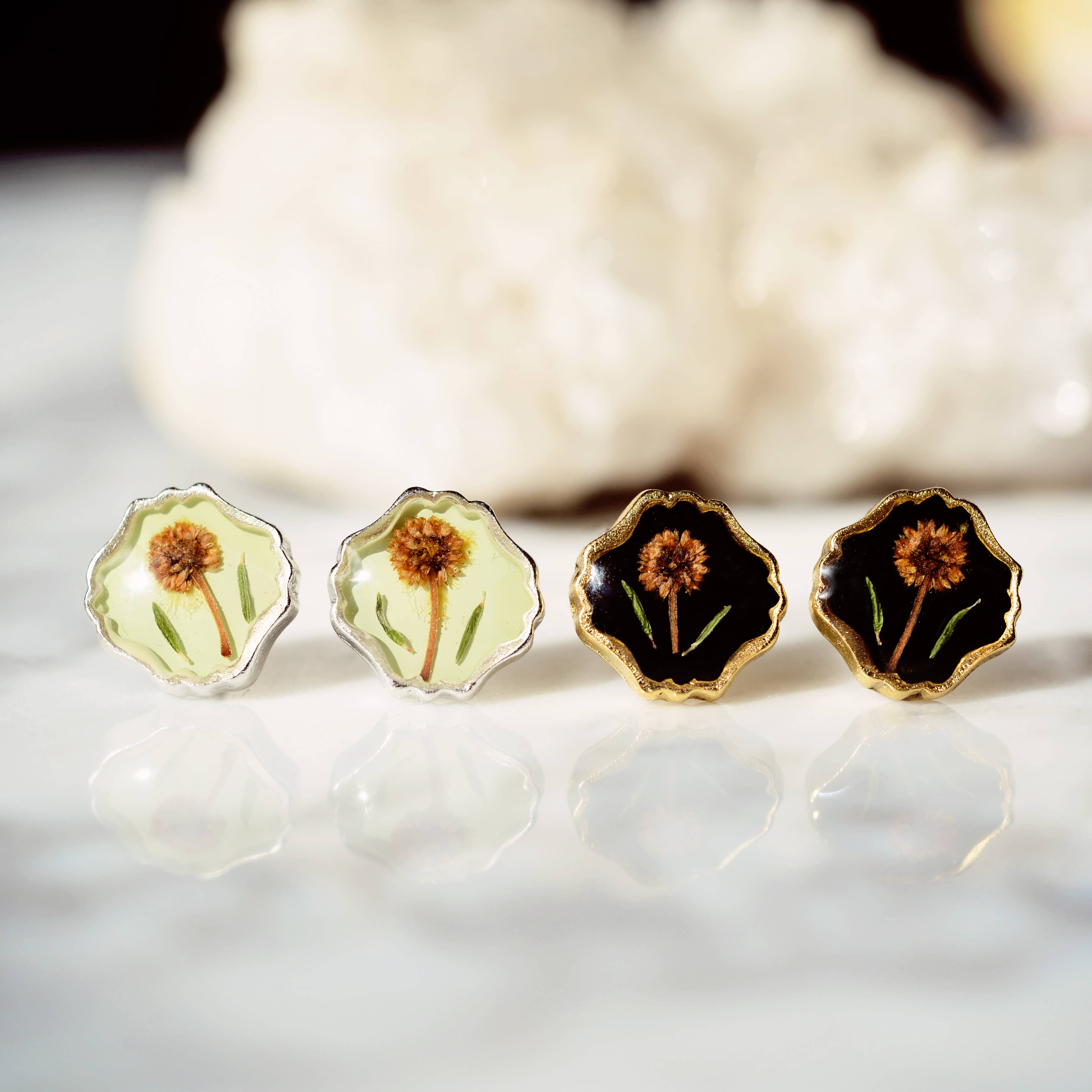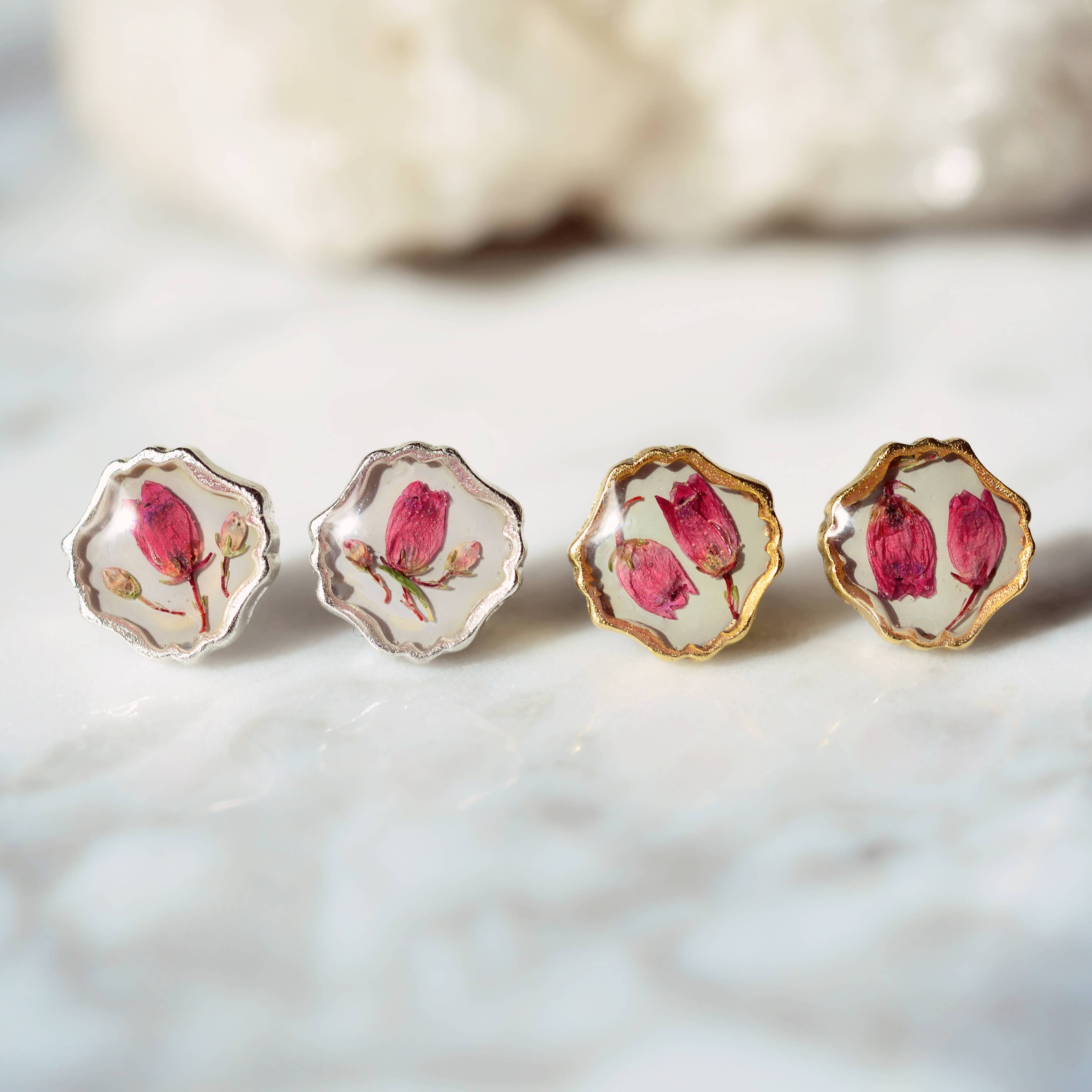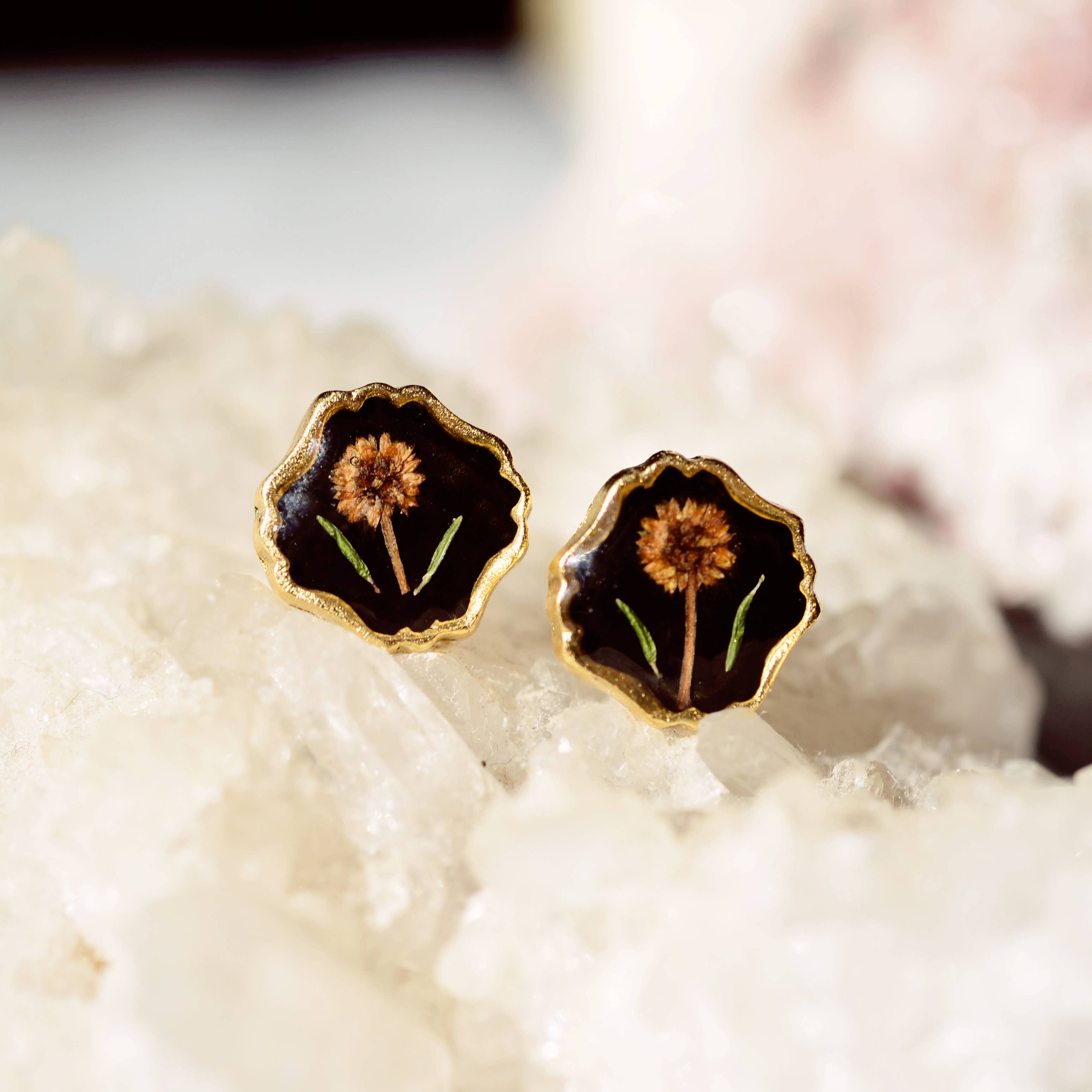 Sweetest earrings featuring pressed flowers set in resin. Choose from mimosa flower on black or heather pink flowers in 24kt gold plated or .995 sterling silver plated high quality, beautiful settings. Steel posts backings.
