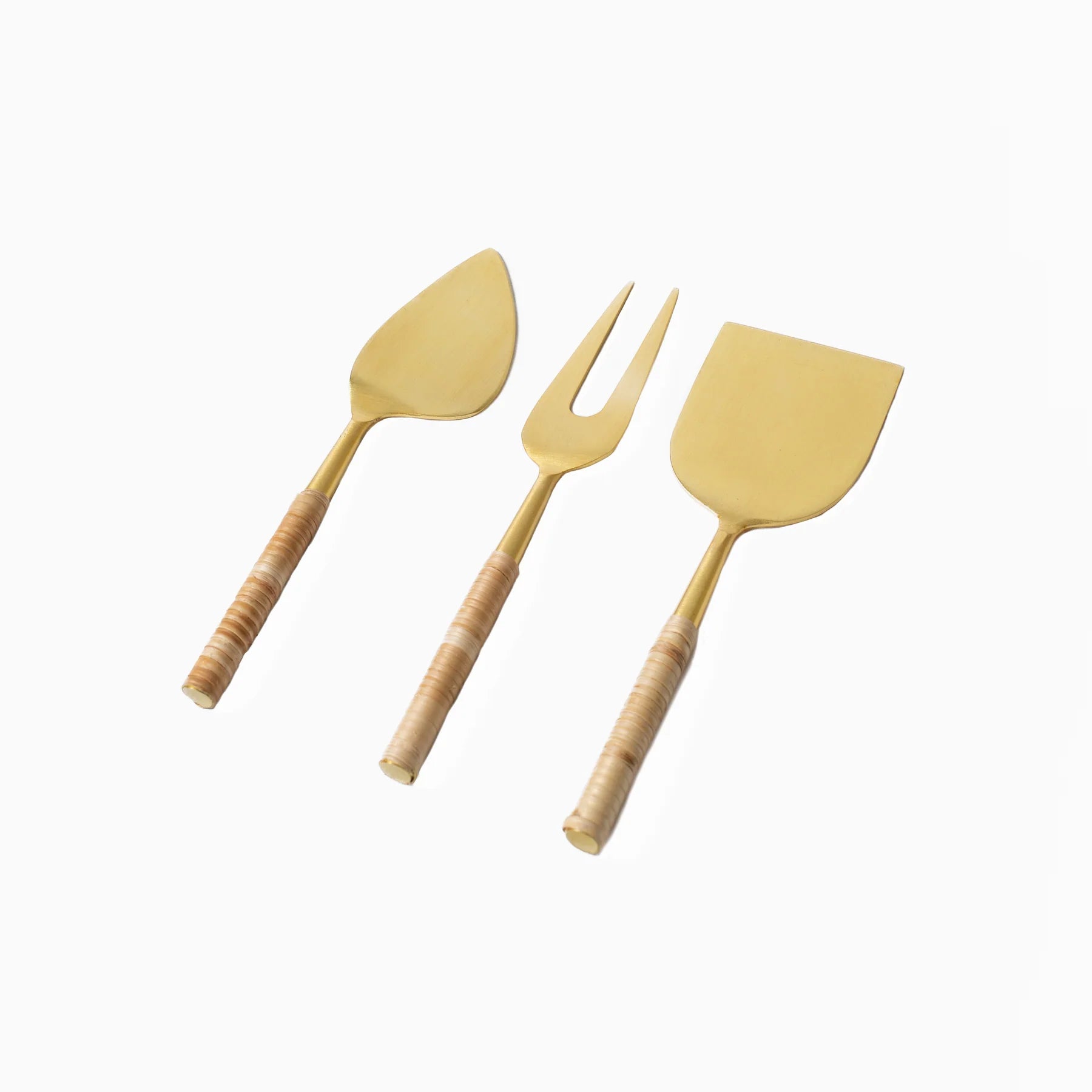 This strikingly contemporary set of stainless steel cheese knives features avant-garde silhouettes and intricately rattan-wrapped handles. Utilize in a kitchen or dining area of any style from modern boho to minimalist. Do not use any harsh cleansers or polish when cleaning. Hand Wash Only