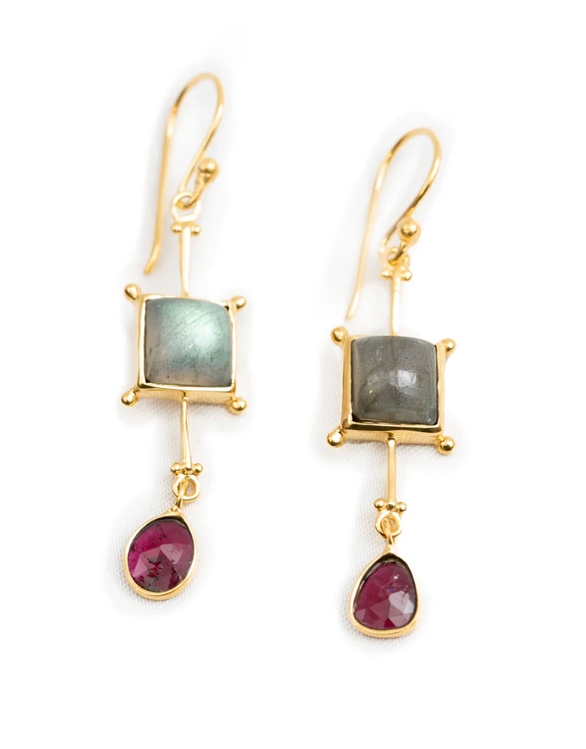 Playful earrings featuring watermelon tourmaline and labradorite stones that celebrate nature's beautiful imperfections. Each pair is one-of-a-kind, with unique variations in stone size and color that make them truly special. Perfect for adding a pop of personality to any look.