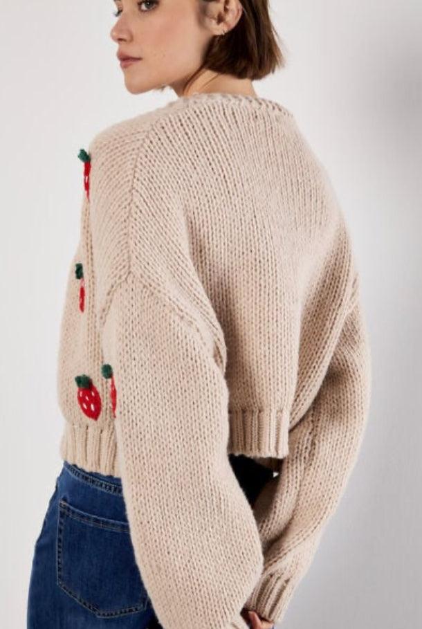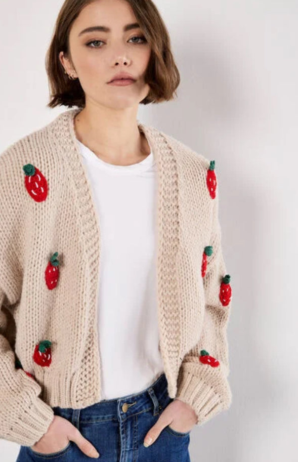 Snuggle up in this adorable strawberry-patterned cardigan that’s as fun as it is cozy. Its cropped fit adds a playful touch to your outfit, making it perfect for layering over your favorite tops. Brighten your wardrobe with this sweet staple that’s sure to bring smiles wherever you go.