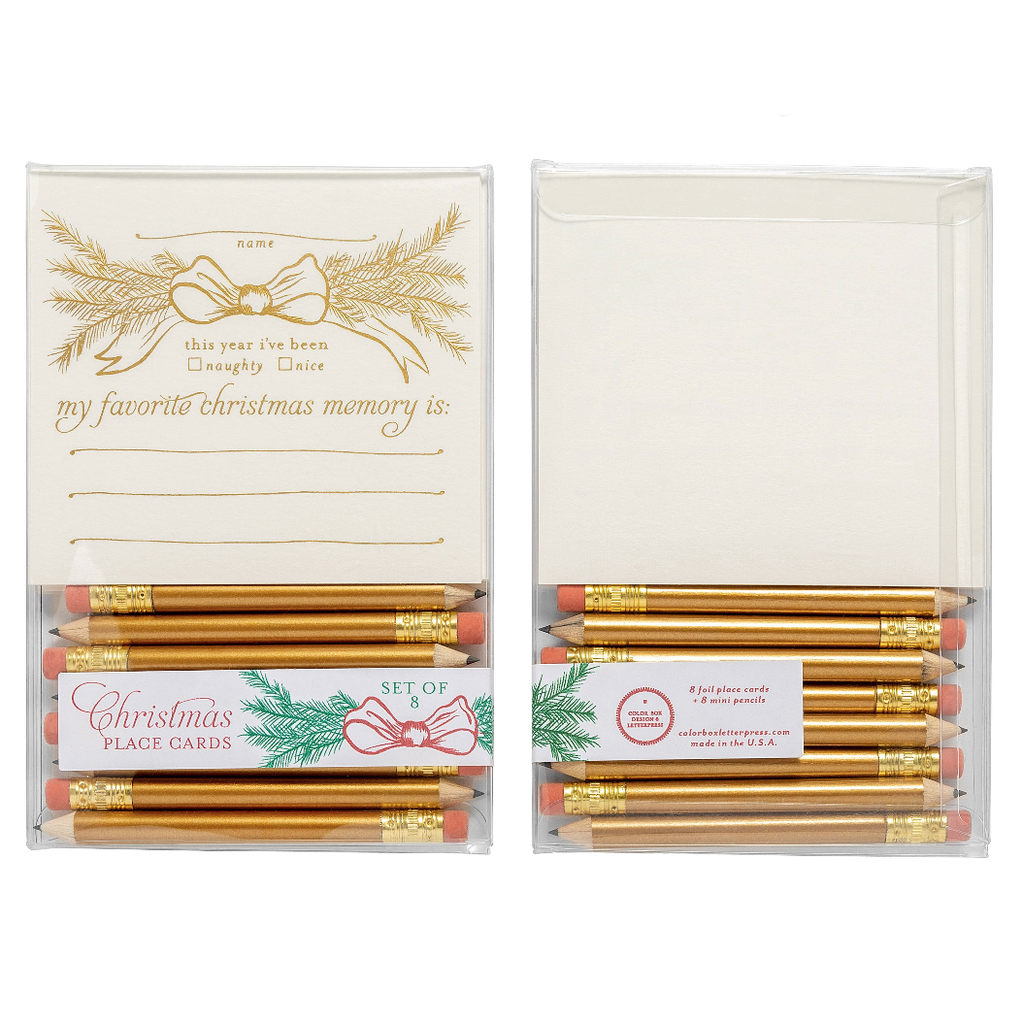 Each set comes with 8 letterpress place cards + 8 mini gold pencils.