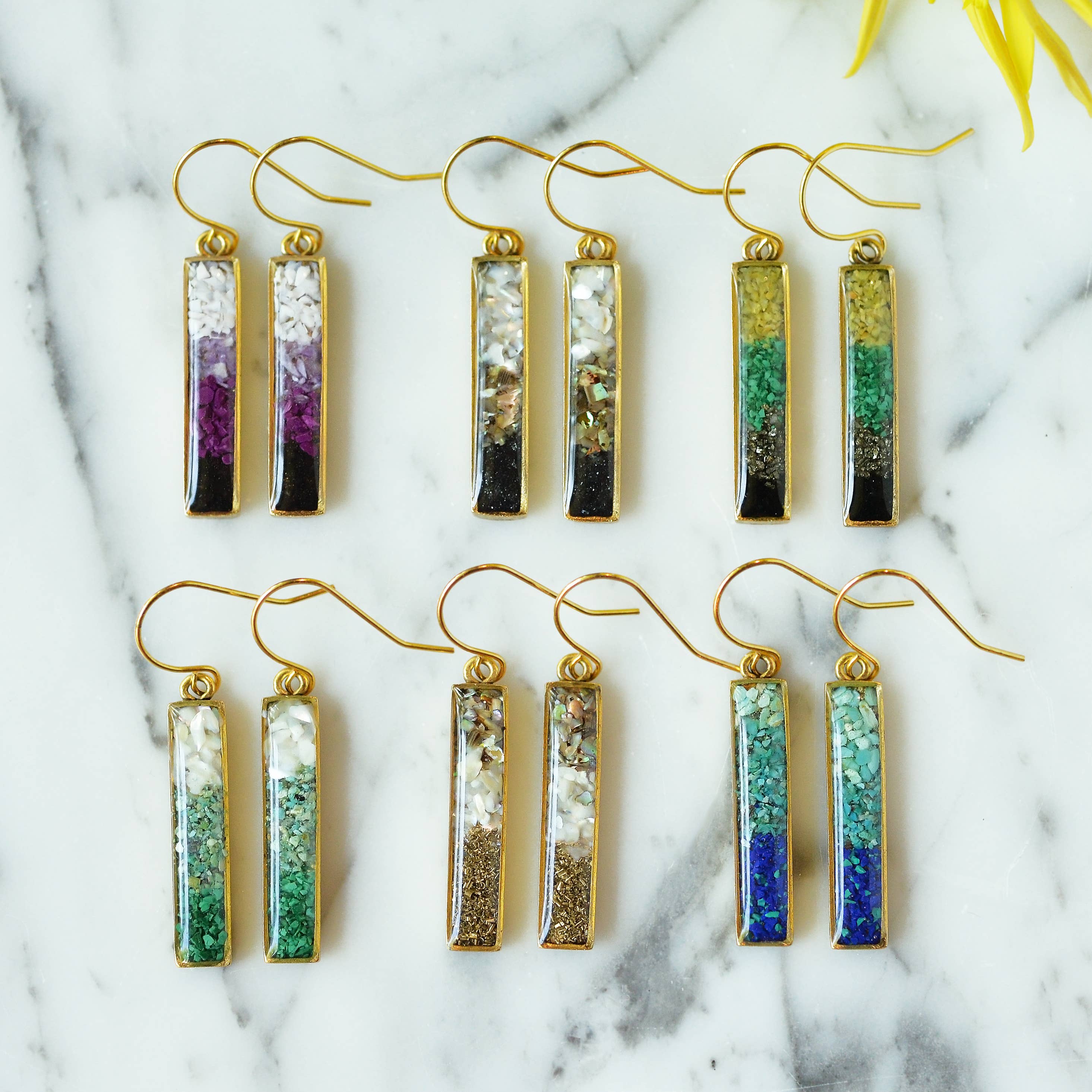 Fun and beautiful colorblock gemstone bar dangle earrings are set on gold plated rectangular base with gold plated ear wire. Gold filled and sterling silver also available.