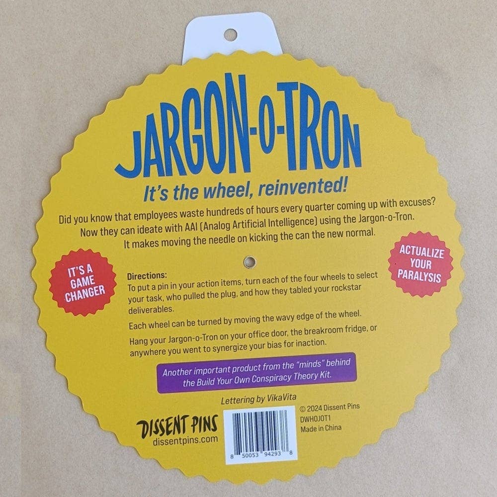 It's the wheel, reinvented! Our new Jargon-o-Tron makes moving the needle on kicking the can the new normal. This wheel uses AAI (Analog Artificial Intelligence) to help you make excuses using the most up-to-date corporate jargon. How to use the Jargon-o-Tron: To put a pin in your action items, turn each of the four wheels to select your task, who pulled the plug, and how they tabled your rockstar deliverables.