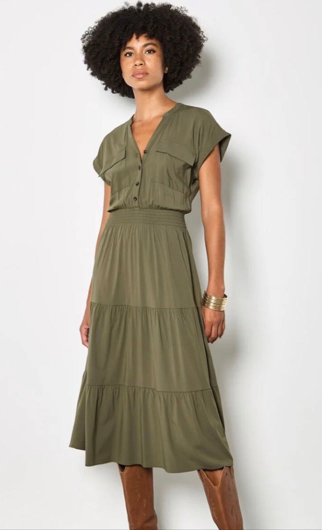 Embrace the utility trend with this versatile midi dress that effortlessly transitions from office to weekend. Crafted from soft woven fabric, it features a flattering V-neck with button-down bodice, functional twin chest patch pockets, and a smocked waist that cinches beautifully. The tiered skirt creates a flowing, feminine silhouette that moves with you.
