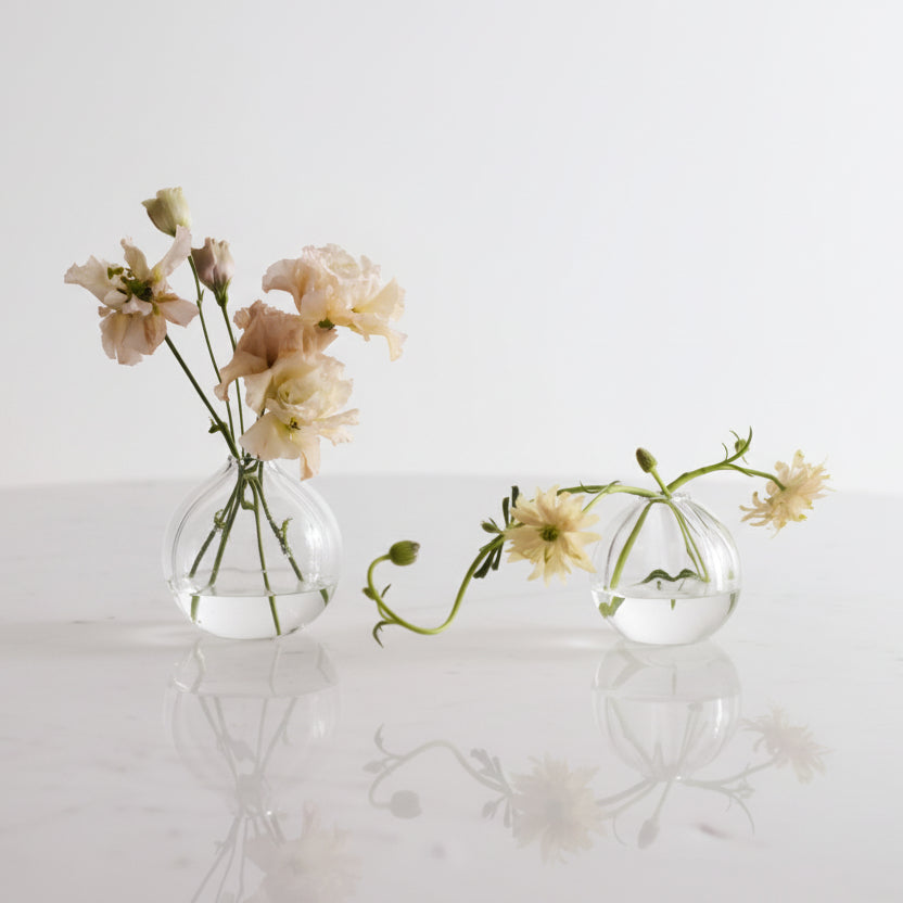 Add delicate elegance to a tabletop scene with the beautiful Viola Bud Vases, handmade from clear borosilicate glass. Featuring a slightly puckered opening, a low, rounded silhouette, & dimensional details for a bit of texture, these vases are ideal for wedding & event design or home styling.