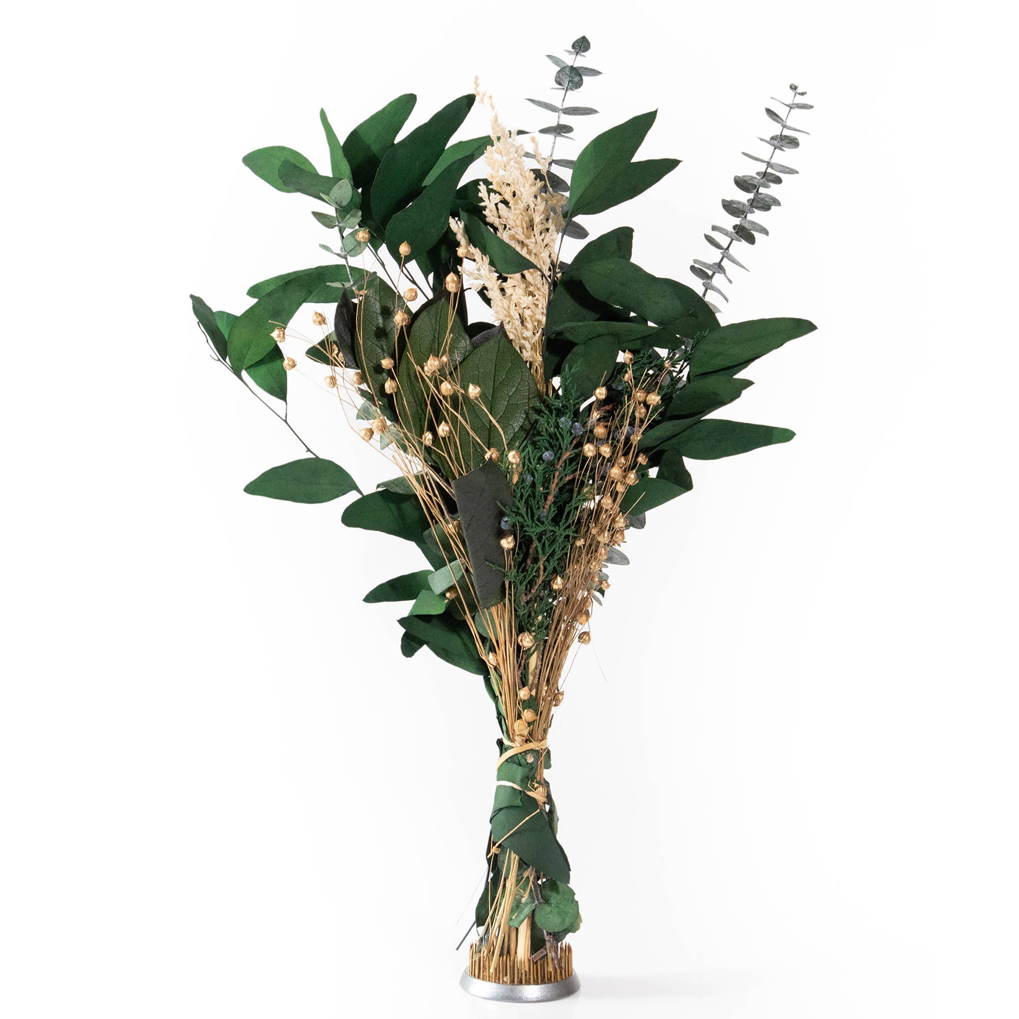 This delicate & petite size bouquet was designed using a mix of baby eucalyptus, willow, juniper, flax, and grains to create this holiday farmhouse bouquet look. Each bouquet is designed and handcrafted in California. - 16" long